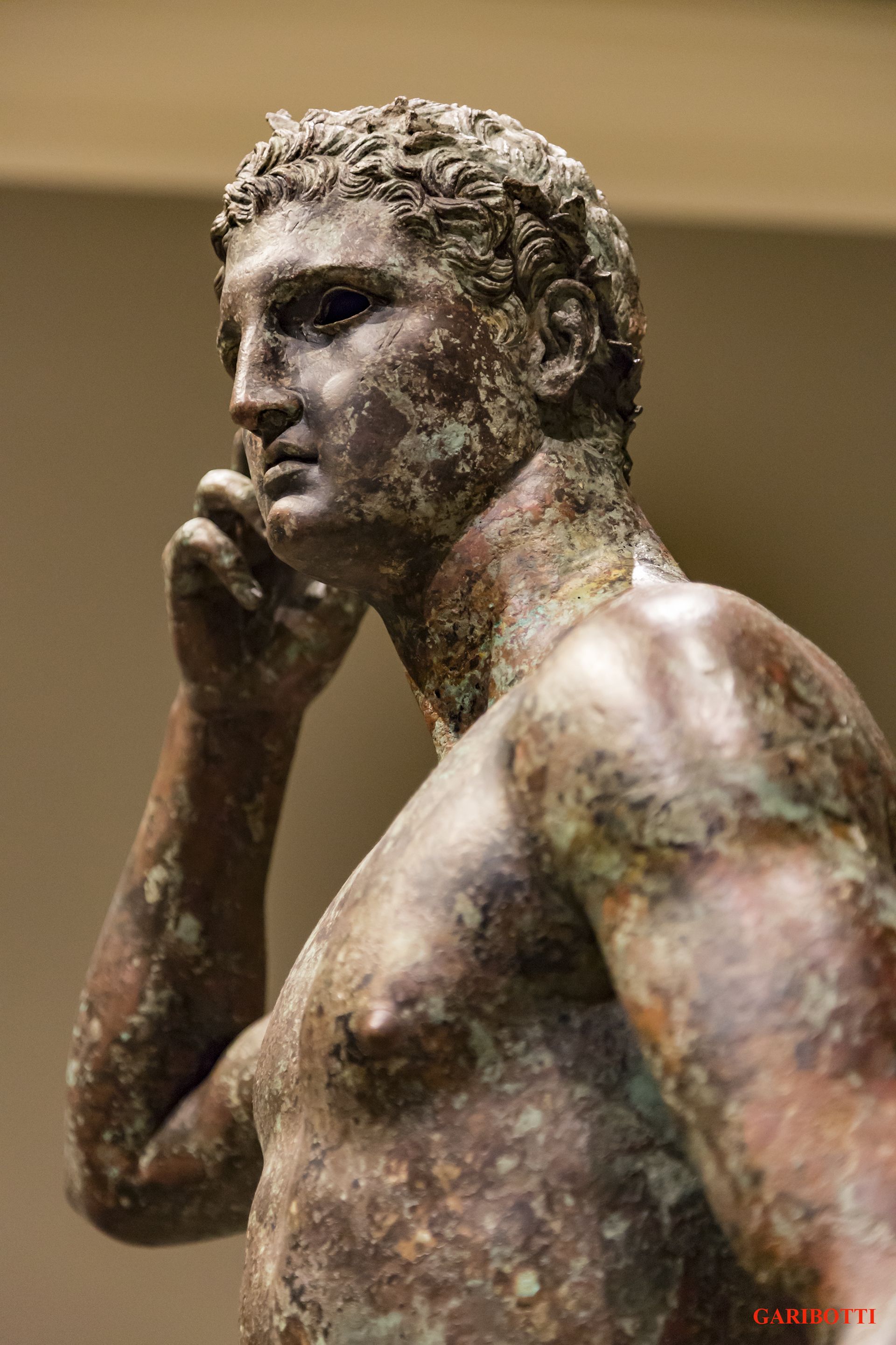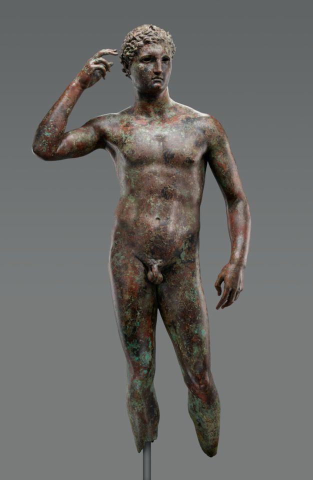 這尊希臘勝利青年雕像(Victorious Youth)的製作年代在公元前三百年至一百年,專家認為出自希臘著名雕塑家留西波斯(Lysippos)之手.這座青銅雕像1964年在義大利利佩薩羅附近因為漁民的漁網勾住銅像而發現.盧森堡的骨董商花了六七千美元向漁民買下銅像,然後輾轉於1977年以美金四百萬賣給了蓋蒂博物館,該館將銅像清理後一直在館內公開展示.