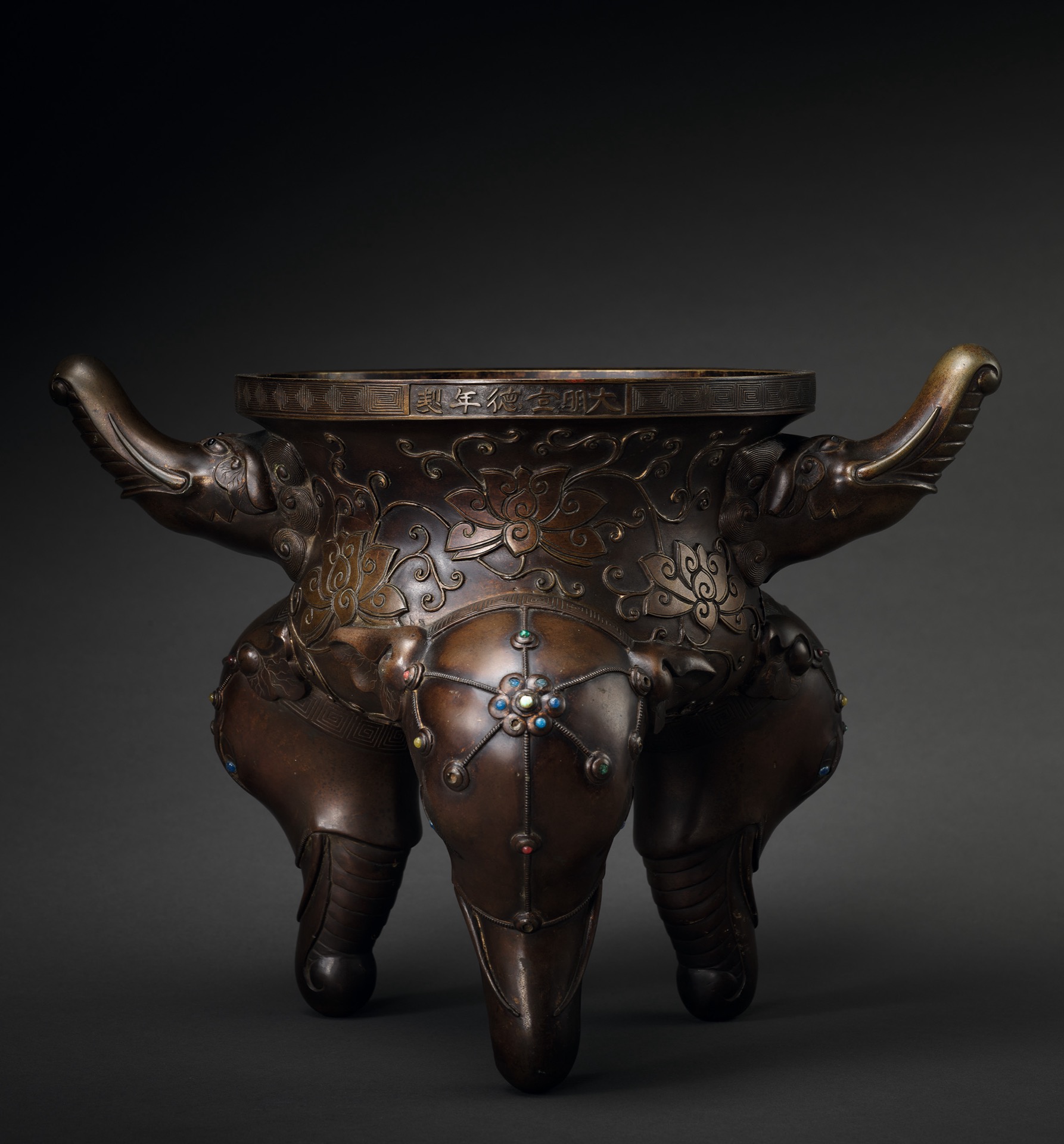 ▲LOT1076 清乾隆 銅雕纏枝蓮紋「太平有象」三足大爐,L49xH34.5cm,預估價範圍新台幣280萬至350萬。