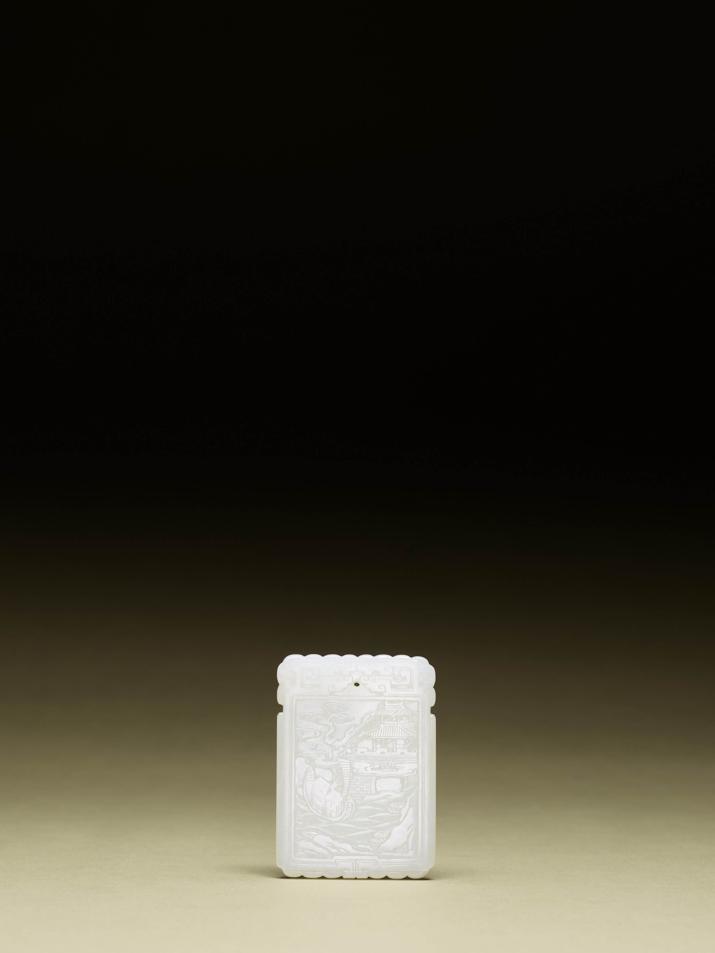 白玉詩文牌呈長方片狀,玉質純白潤澤,色澤勻淨無暇。雙面均工,雕工繁複而規整。正面長方框內刻唐代詩人王勃《滕王閣》首四句:「滕王高閣臨江渚,珮玉鳴鸞罷歌舞。畫棟朝飛南浦雲,珠簾暮捲西山雨。」並陰刻「辛丑春日一七八一」、「芝亭」及「山人」印款,字體俊秀挺拔。背面以淺浮雕壓地刻繪滕王閣景象:三層樓閣聳立於江岸,雲煙縹緲,蒼松挺立,水波蕩漾,一條滿載的帆船行駛其間。玉牌頂端雕雙龍聚首,中央穿孔,龍身自上而下盤繞,環抱長方框。此作玉質精良,工藝嚴謹,充分展現乾隆時期白玉牌工的華麗風範與文人情趣。