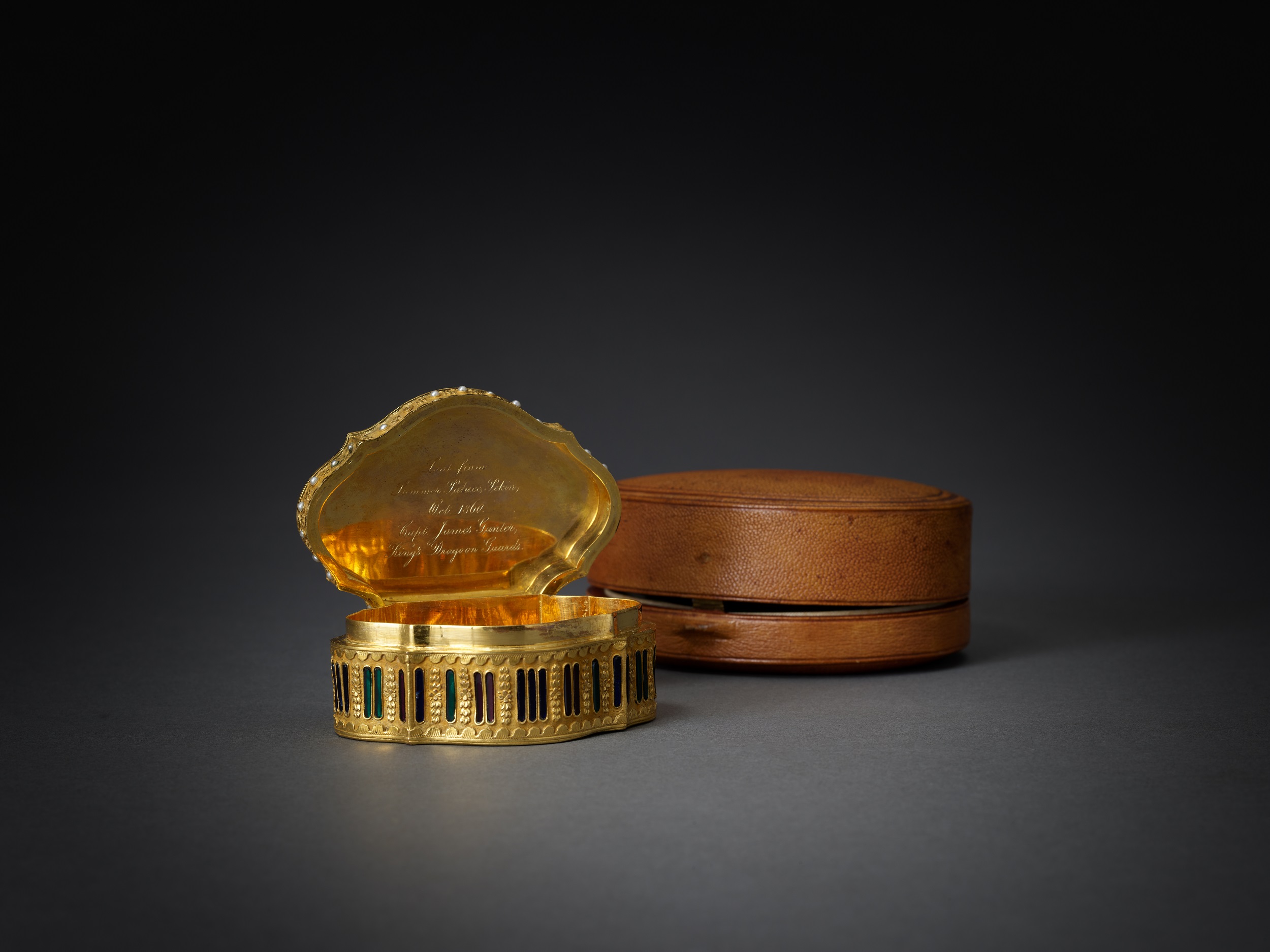 盒蓋內壁鐫刻英文銘文:「Loot from the Summer Palace, Pekin, Oct. 1860. Capt. James Gunter, King’s Dragoon Guards.」此一銘文直接標明其來源,為英法聯軍於1860年第二次鴉片戰爭侵入北京時,自圓明園劫掠而出。此件鼻煙盒不僅為御用珍玩,更因其確切來源而成為研究清宮西洋工藝品與近代中西文化衝突的重要實物。