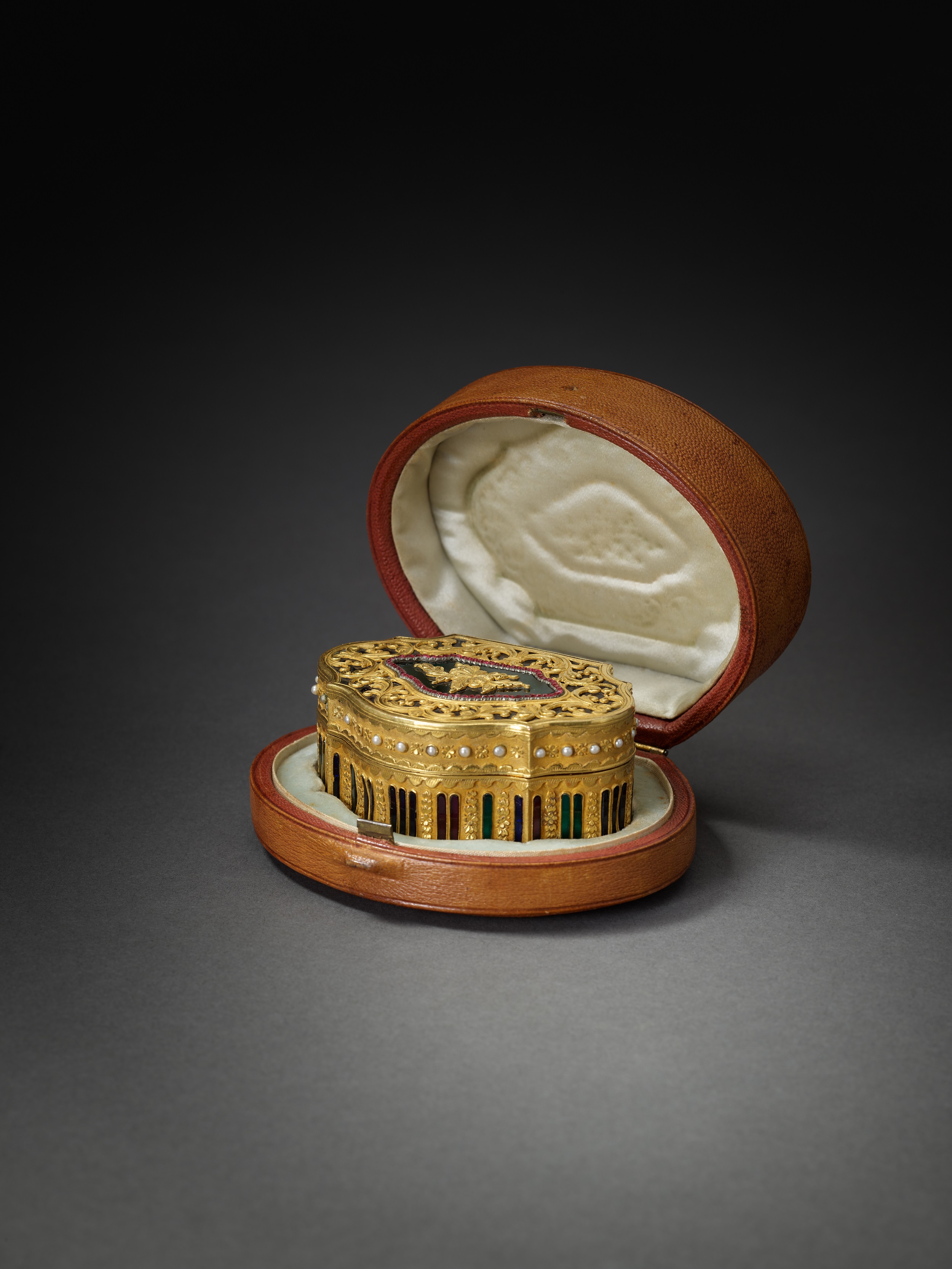 此件鼻煙盒以銅胎鍍金為基,造型小巧規整,長方形略呈圓角。盒蓋與盒身皆以掐絲琺瑯鋪飾,並鑲嵌珍珠及多色寶石,設計瑰麗繁縟。紅、綠、藍等色寶石與珍珠錯落排列,與鎏金與琺瑯相互輝映,充分體現乾隆宮廷御製器物的華貴審美。通體構造嚴謹、色澤鮮麗,工藝細密精湛,是清代盛世宮廷奢華器物的代表。