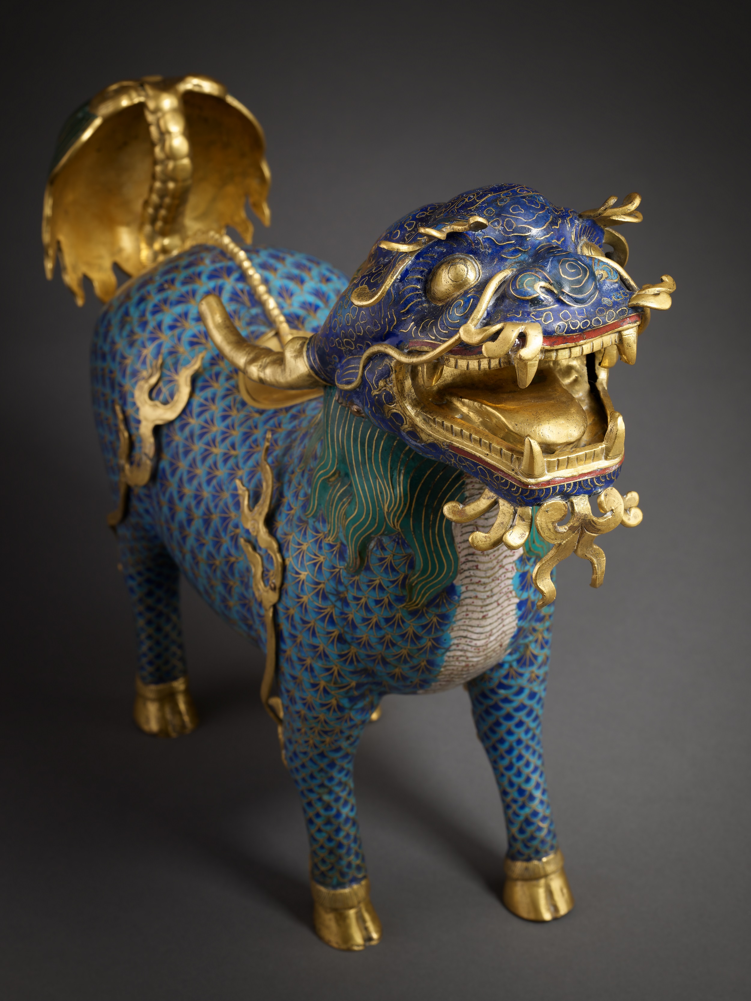 清代乾隆時期,宮廷造辦處推崇祥瑞題材與華麗工藝,其中以掐絲琺瑯所製的大型陳設器,最能體現帝王權威與文化審美。麒麟香爐便是其中的代表作。麒麟作昂首張口之姿,雙角直立,四肢勁健挺拔,胸腹及四肢飾以火焰披毛紋,尾部毛髮層層舒展,背負寶瓶以盛香煙,寓意「太平有象」。整體造型雄健莊嚴,兼具威儀與華美,顯示乾隆宮廷對祥瑞意象的極致演繹。