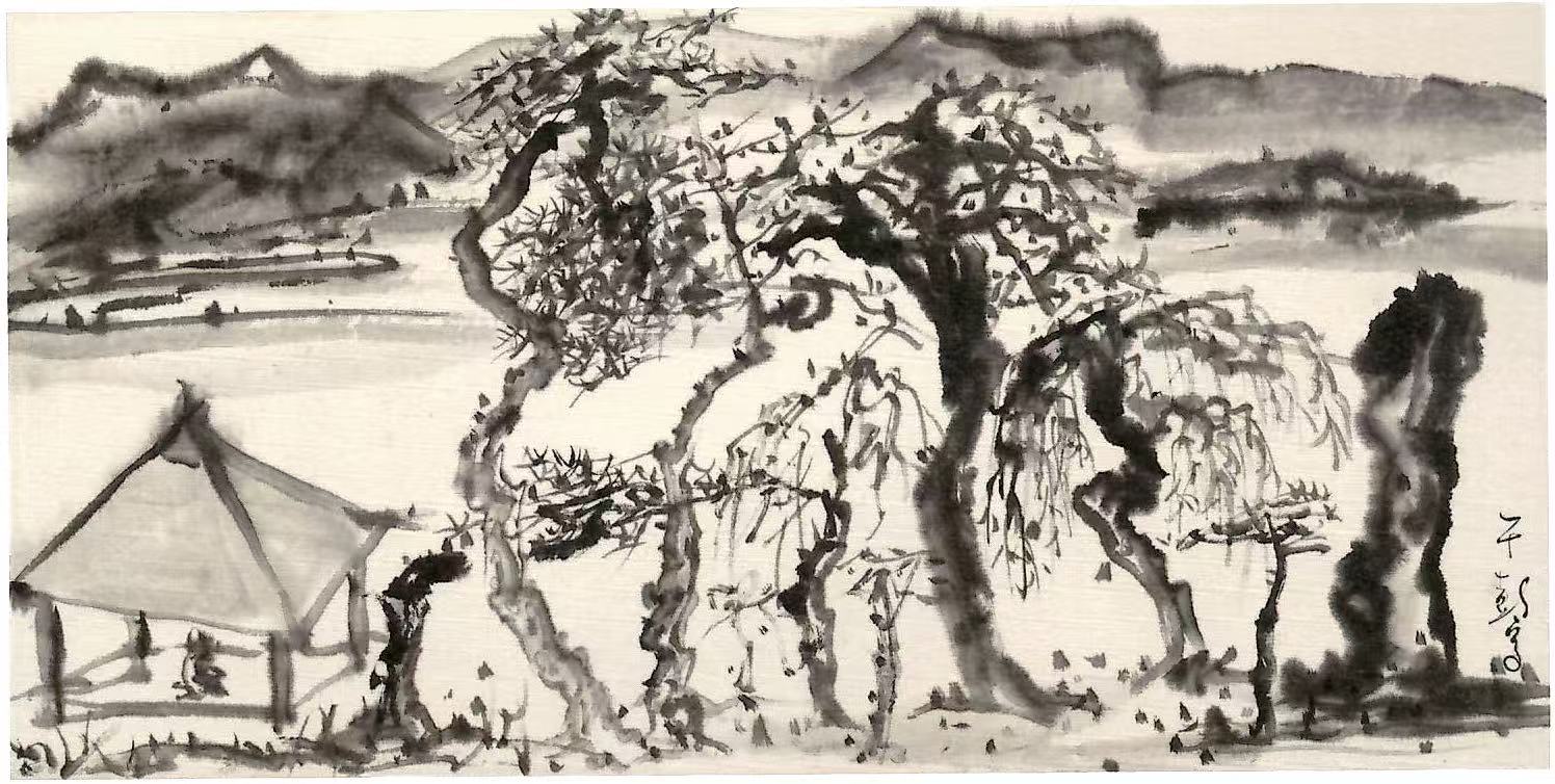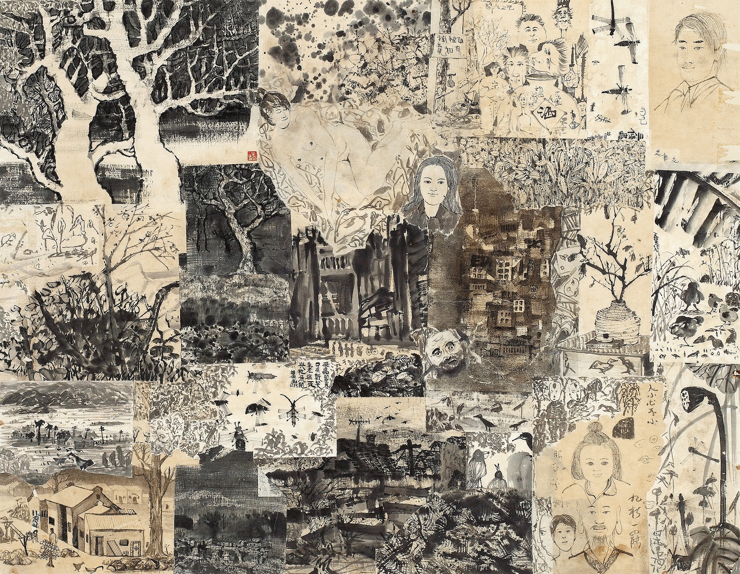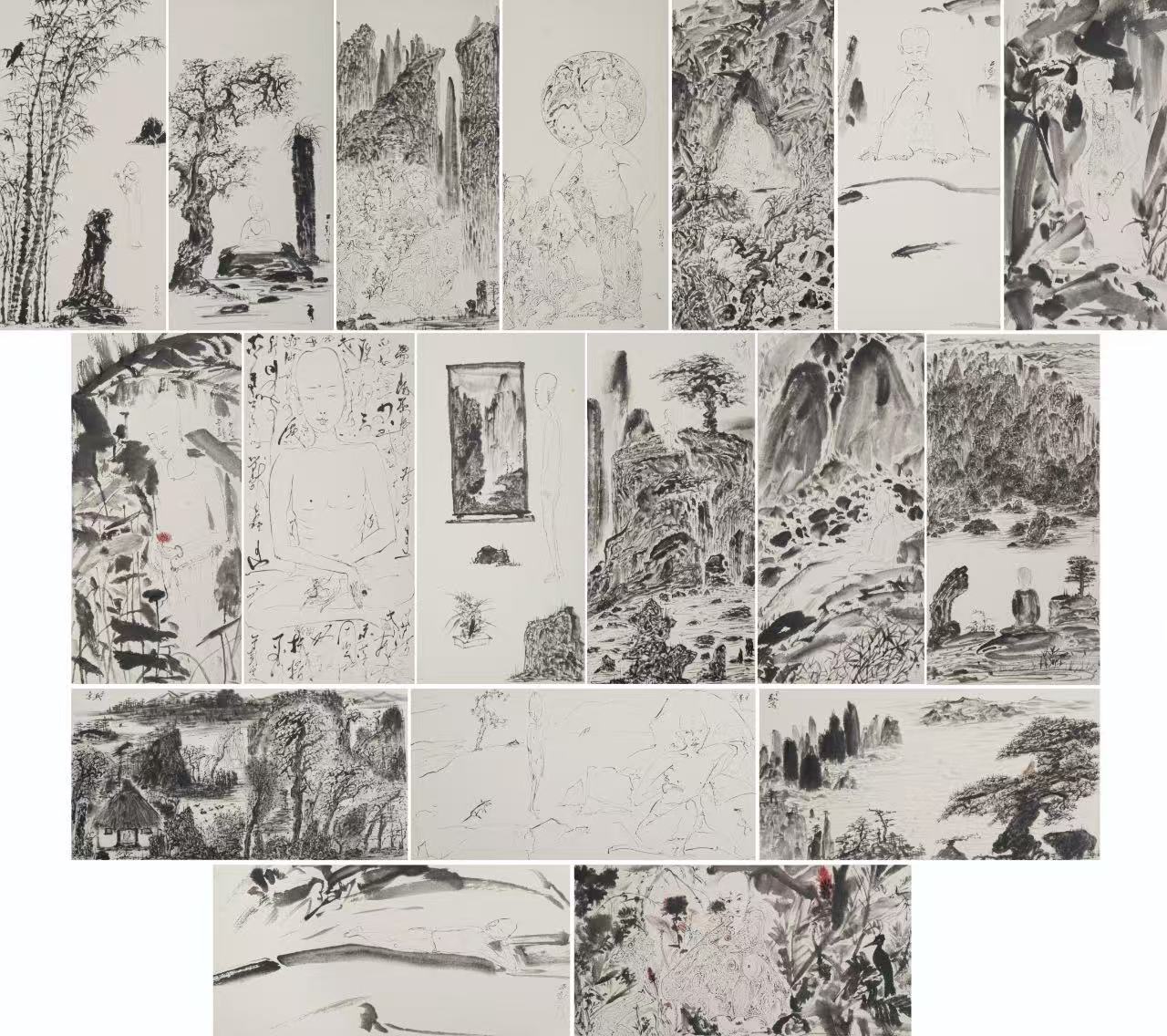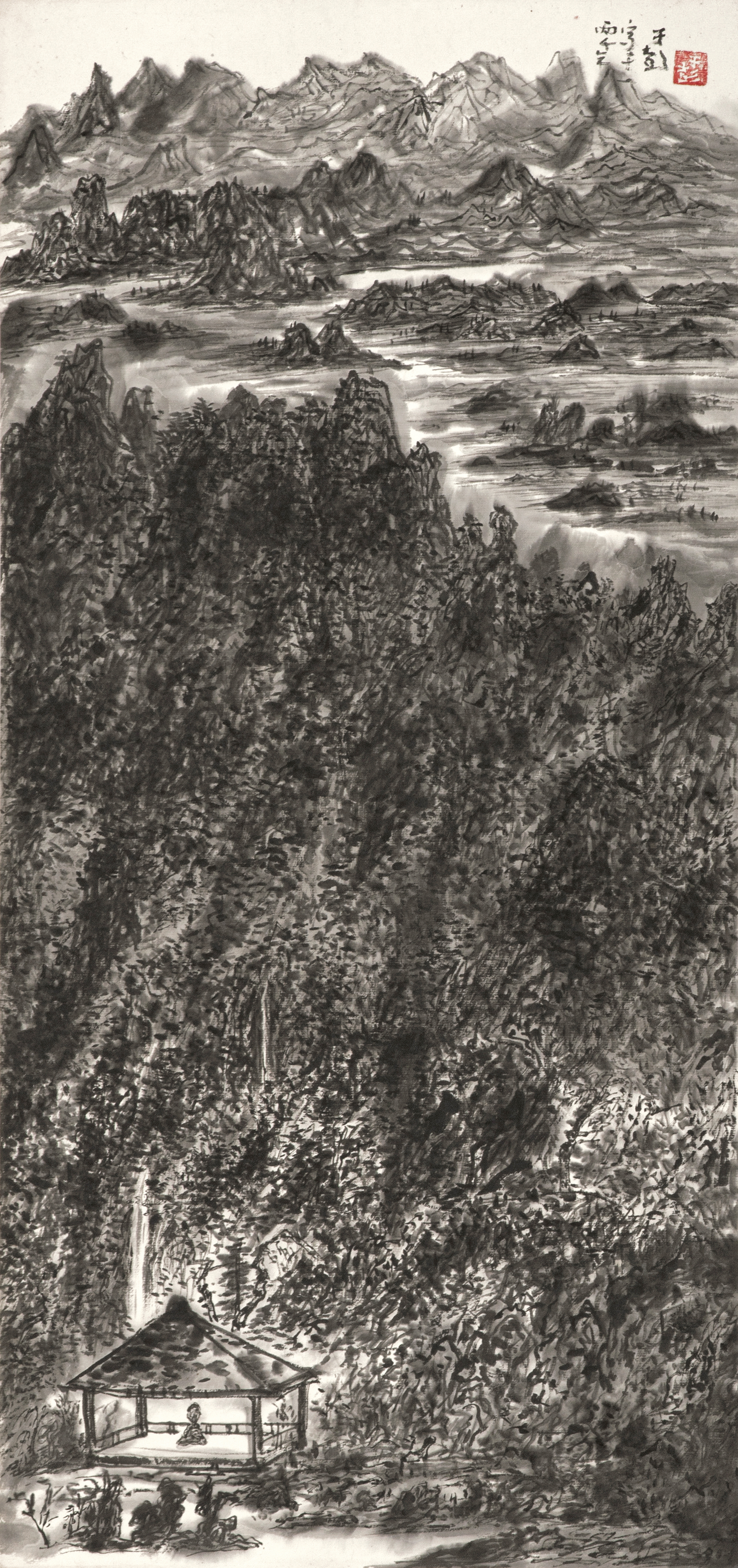 展出作品橫跨不同時期,風貌各異。中期的〈山水〉(2000)構圖縝密、筆墨細膩,展現壯闊景致與「情境式山水」的創造精神;晚期的〈十八羅漢〉(2009)人物形象亦聖亦凡,游走於天界與人世之間,蘊含戲謔與溫度。2010 年的〈靜默以對〉、〈花間笑〉、〈山水之間〉與〈筆墨微觀〉等小尺幅作品,展現他對筆墨語言的深入探索,意象流動如詩,如仙人遊走人間,隨心吟就詩句。〈日記〉此一作品則以蒙太奇方式拼貼日常片段,記錄生命的流轉與書寫的痕跡。