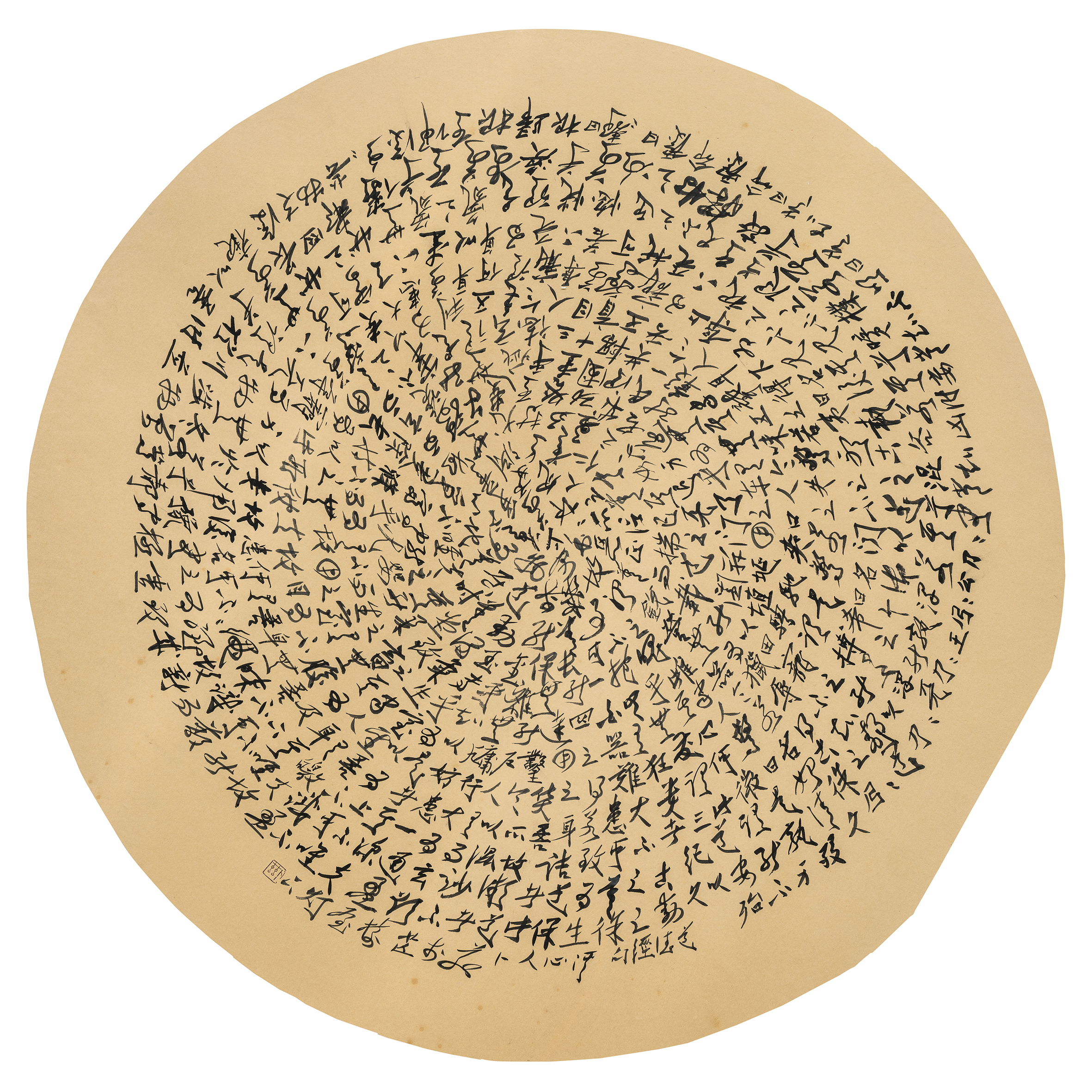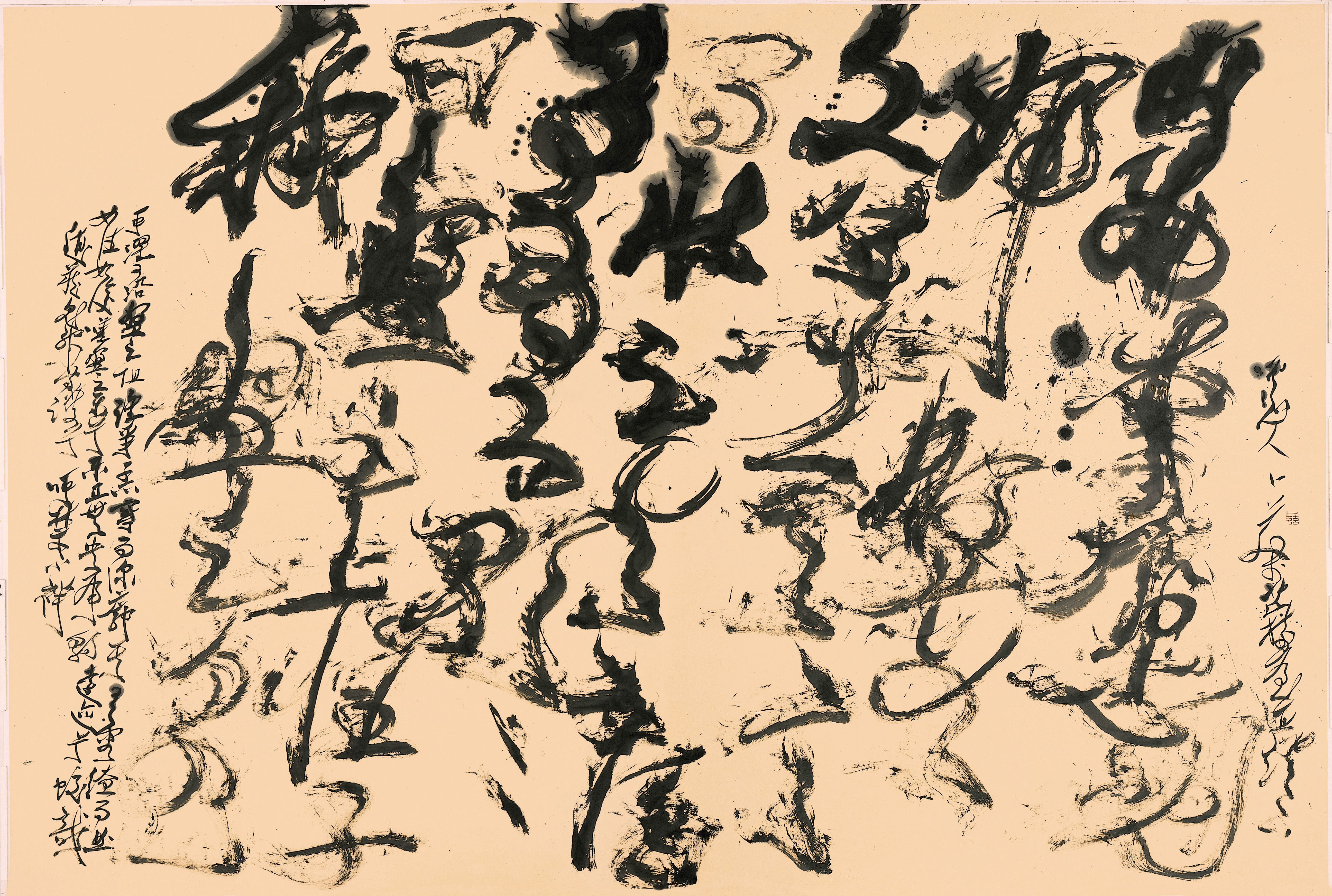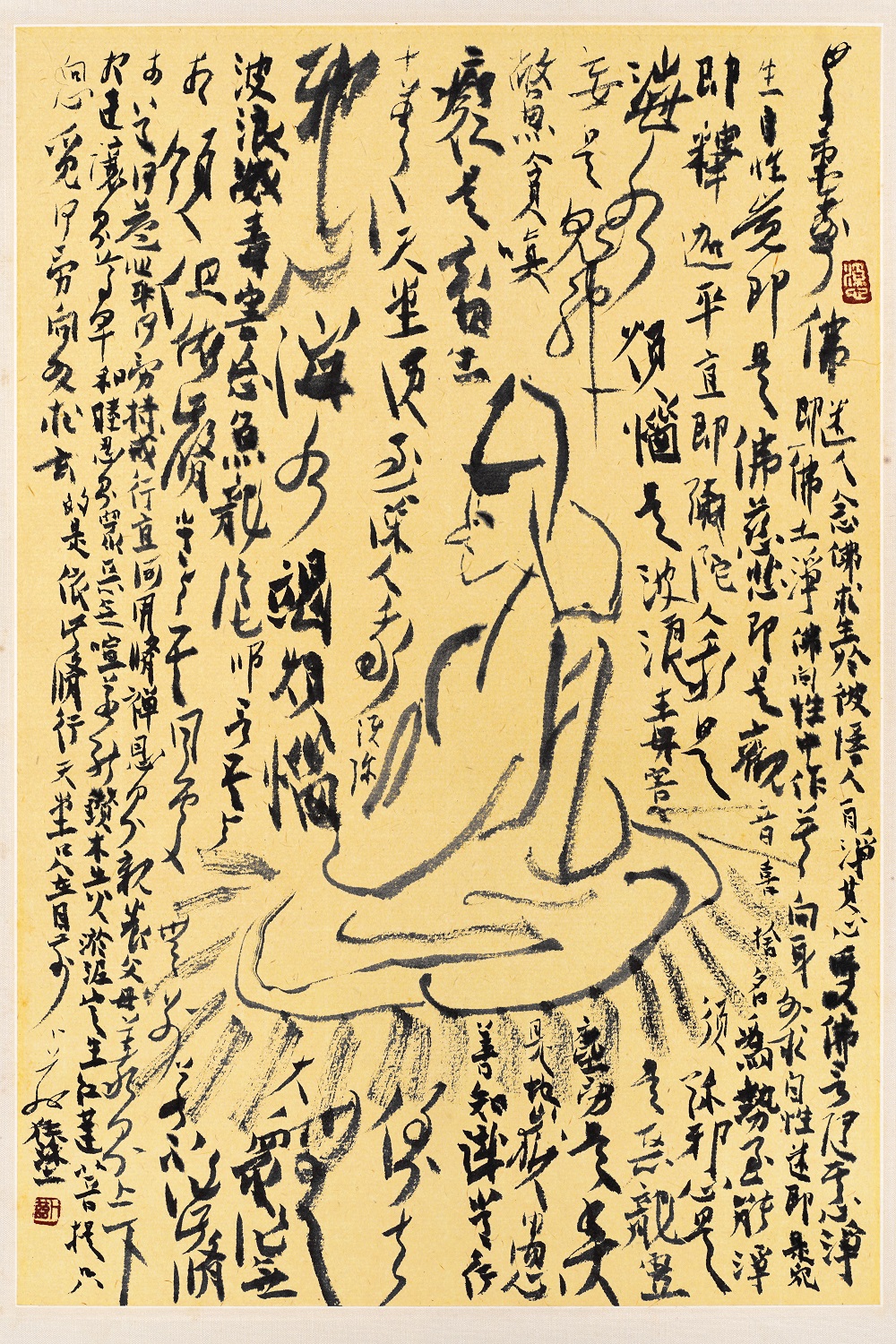 卜兹長年靜坐冥想,以修養氣息為日課。「寫經」對他而言,是定靜的修持,也是書家以一念清明入筆的心法,成為其心性滋養的泉源。他亦從老子《道德經》汲取智慧,體悟「道法自然」的生命哲學。展出作品〈草書道德經句〉與〈美生美〉(2011)為藝術家晚期形式極為特殊的重要作品,讓書法在視覺結構上與當代藝術場域對話。
