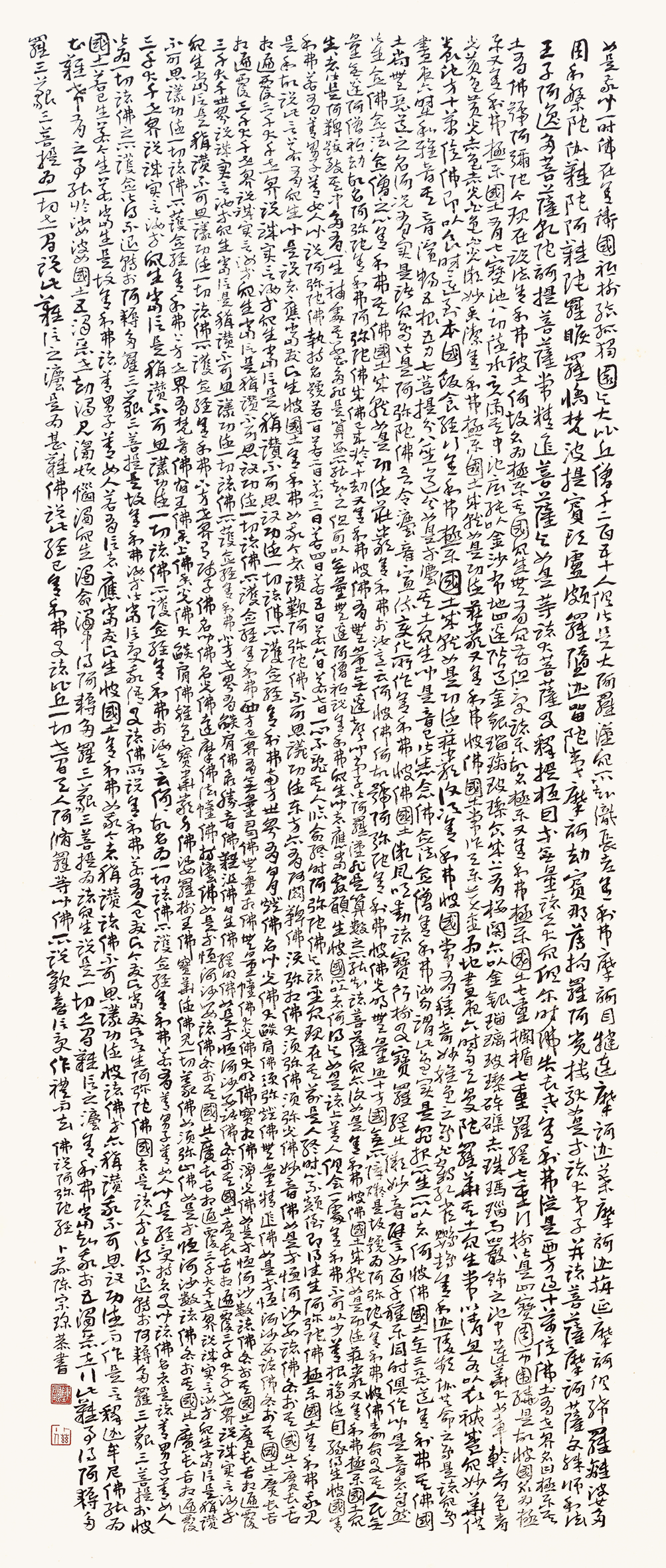 早期〈楷書孝經〉(1996 作,2006 再題)以歐柳唐楷書寫,清勁端嚴,格調高古;十年後再以小字行草題記,流露自省與書風蛻變的體悟。〈佛說阿彌陀經〉以小字章草書寫,筆致內斂靜謐,洋溢禪悅之氣。