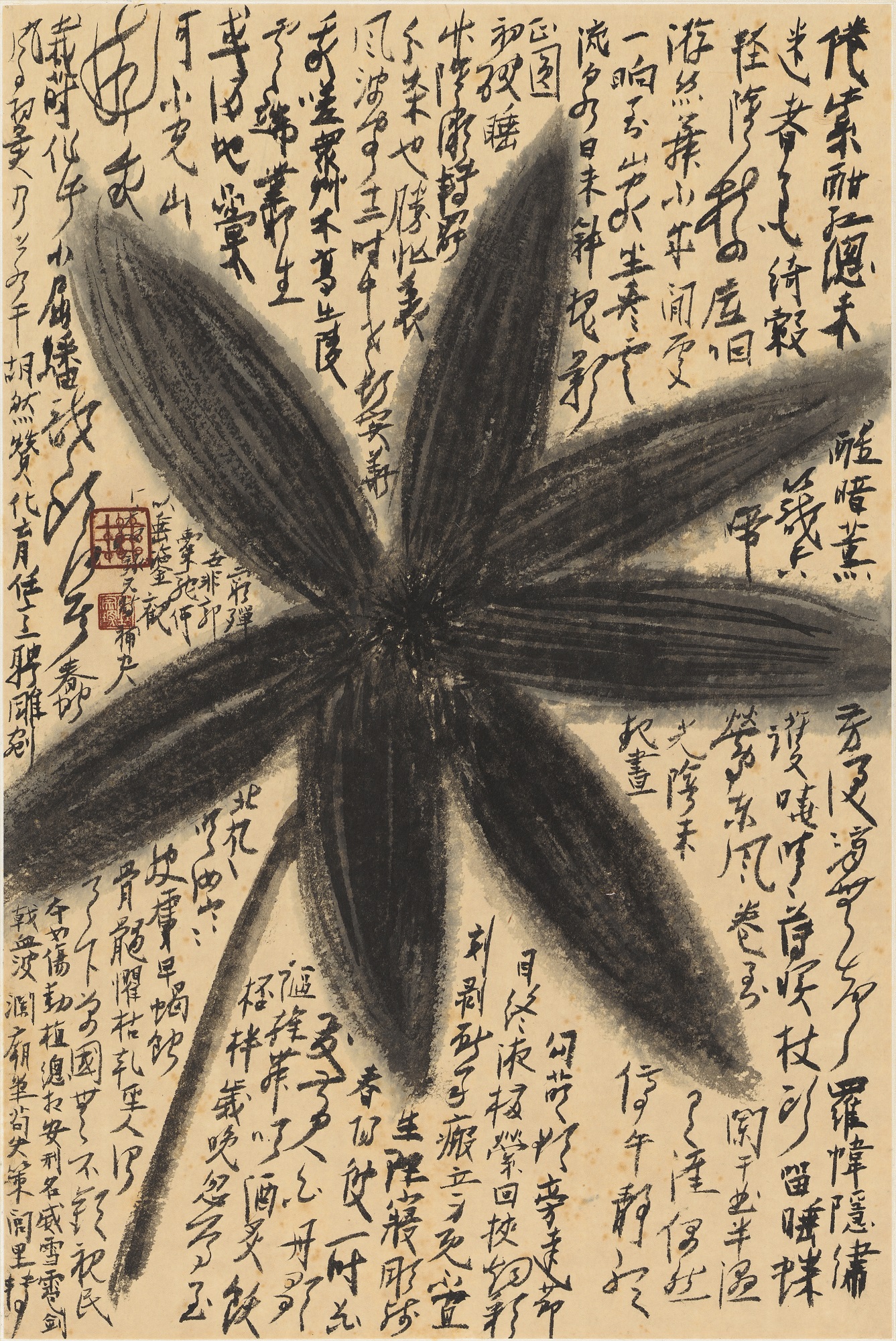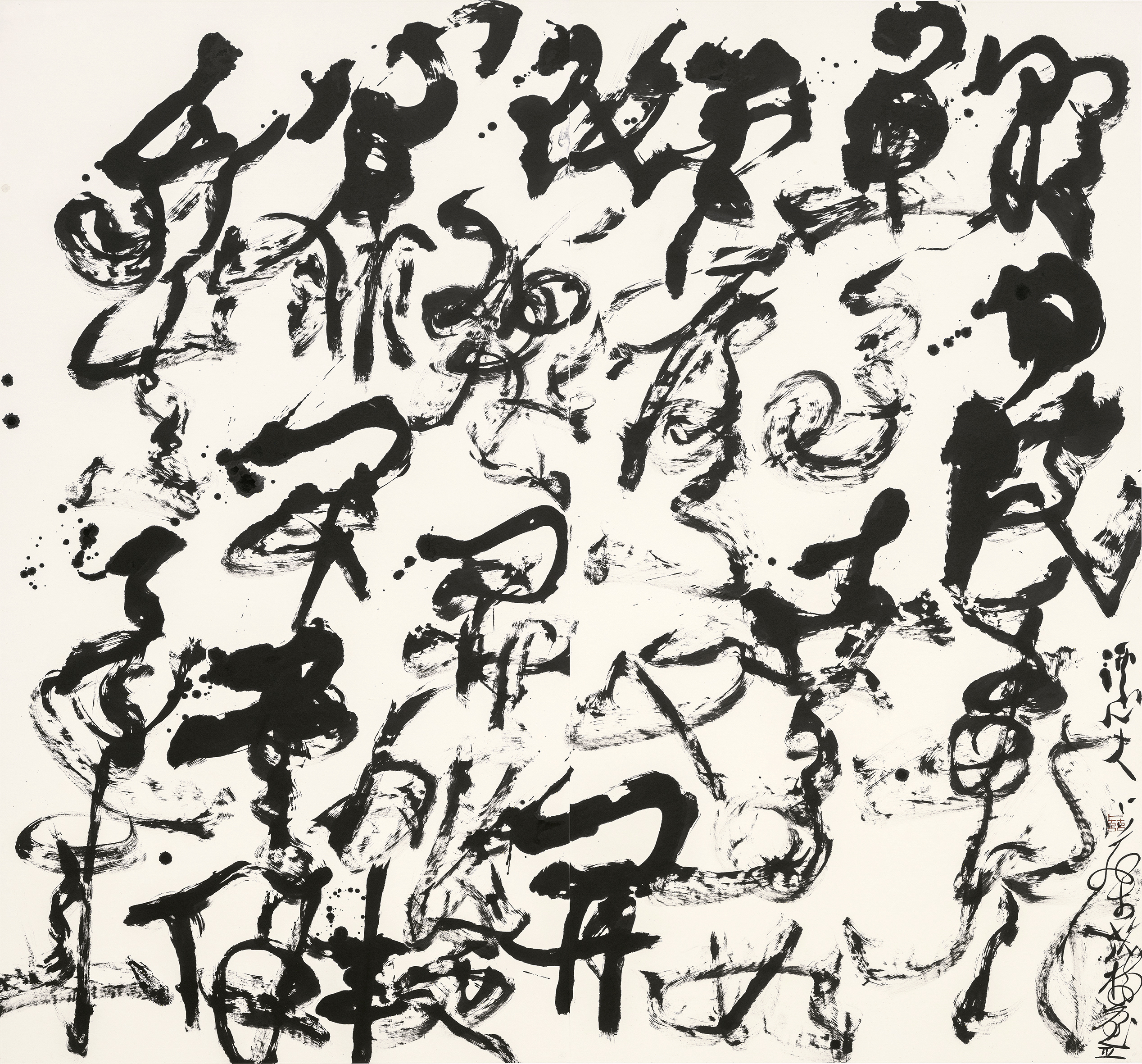 至創作晚期,卜兹以「狂草」實踐書法的極致自由,「八鋒旋書」成為他對線性空間最具體的詮釋。〈玫瑰開眼〉(2010)、〈盤谷歌〉(2011)、〈赤壁懷古〉與〈不鳴之鳥〉等巨幅作品筆勢奔放,墨色濃淡之間透出深沉的呼吸感。線條交錯的動感,或迅疾如風,或凝重如山,展現超越文字語意的節奏之美。