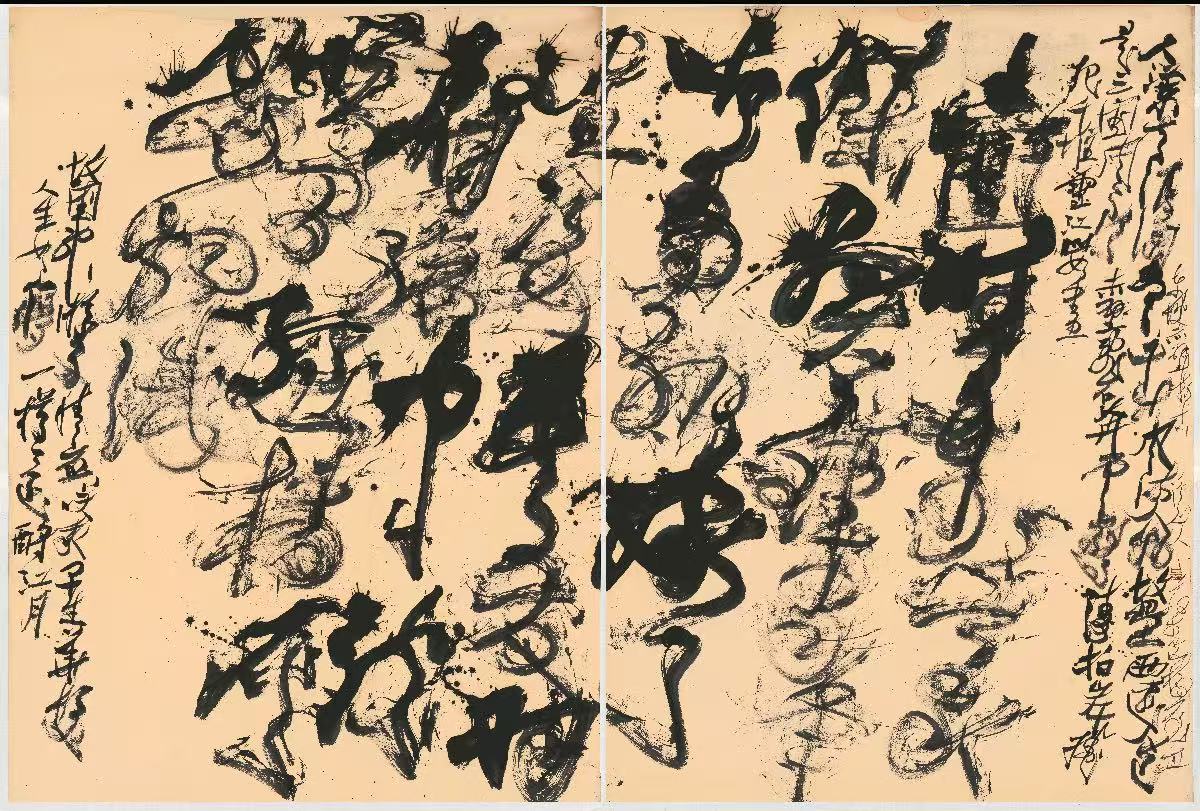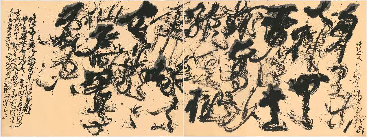 其一是「筆勢與筆觸的表現性」——卜兹草書的勁道與于彭水墨的暈染,在乾濕、快慢之間形成節奏碰撞;其二是「突破邊界的書寫性」——兩人筆墨線條的延展突破形式與領域;其三是「性格化的展現」——卜兹的書勢銳不可擋,流露孤高與自在;于彭的水墨流變,則營造出他心中的理想桃花源。