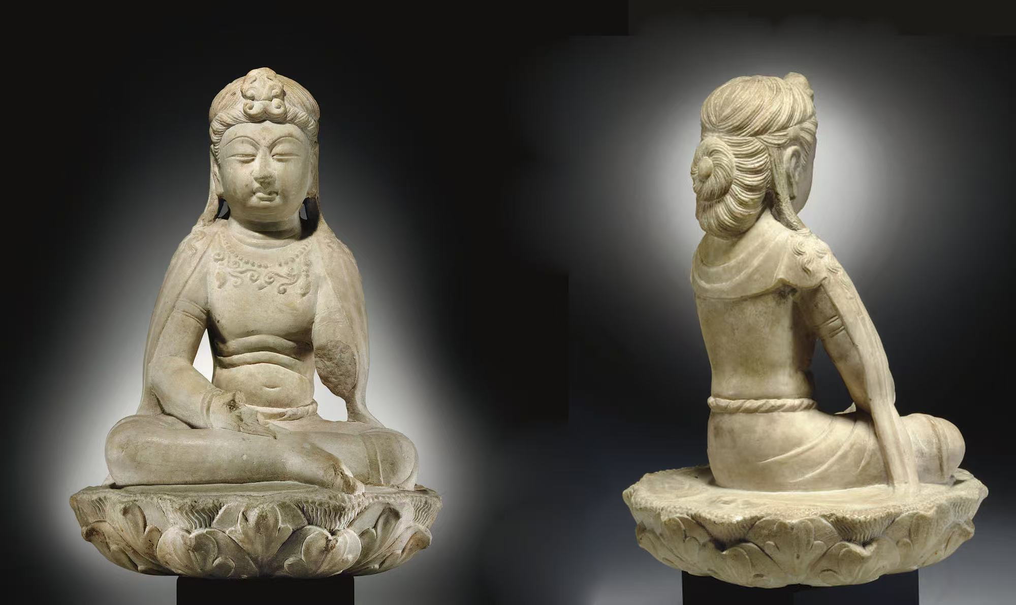都是束高發髻、戴寶冠,冠帶垂於雙肩,上方堆疊髮束;這種髮式正是唐玄宗時期白石菩薩的標準形制。上博藏品確定是佛下方的供養菩薩。沐春堂拍品菩薩坐姿、視線略向下的處理,也明顯是「面向主尊」而非獨立主佛,功能定位相似。