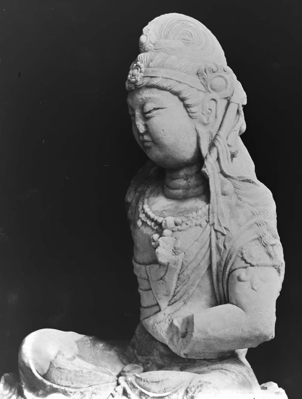 焦點移到美國波士頓美術館 Museum of Fine Arts, Boston的藏品,唐代Bodhisattva on a Lotus Throne,白石(白大理石)菩薩坐像,端坐於圓形蓮座,身軀略作 S 型彎曲,上身裸露、披薄衣與長裙,胸前重疊大串瓔珞。也是盛唐白石圓雕菩薩像。肉感豐滿、衣紋厚重而收斂,強調胸腹與膝部的量感,和沐春堂菩薩的「體塊感+衣紋簡化」非常接近。