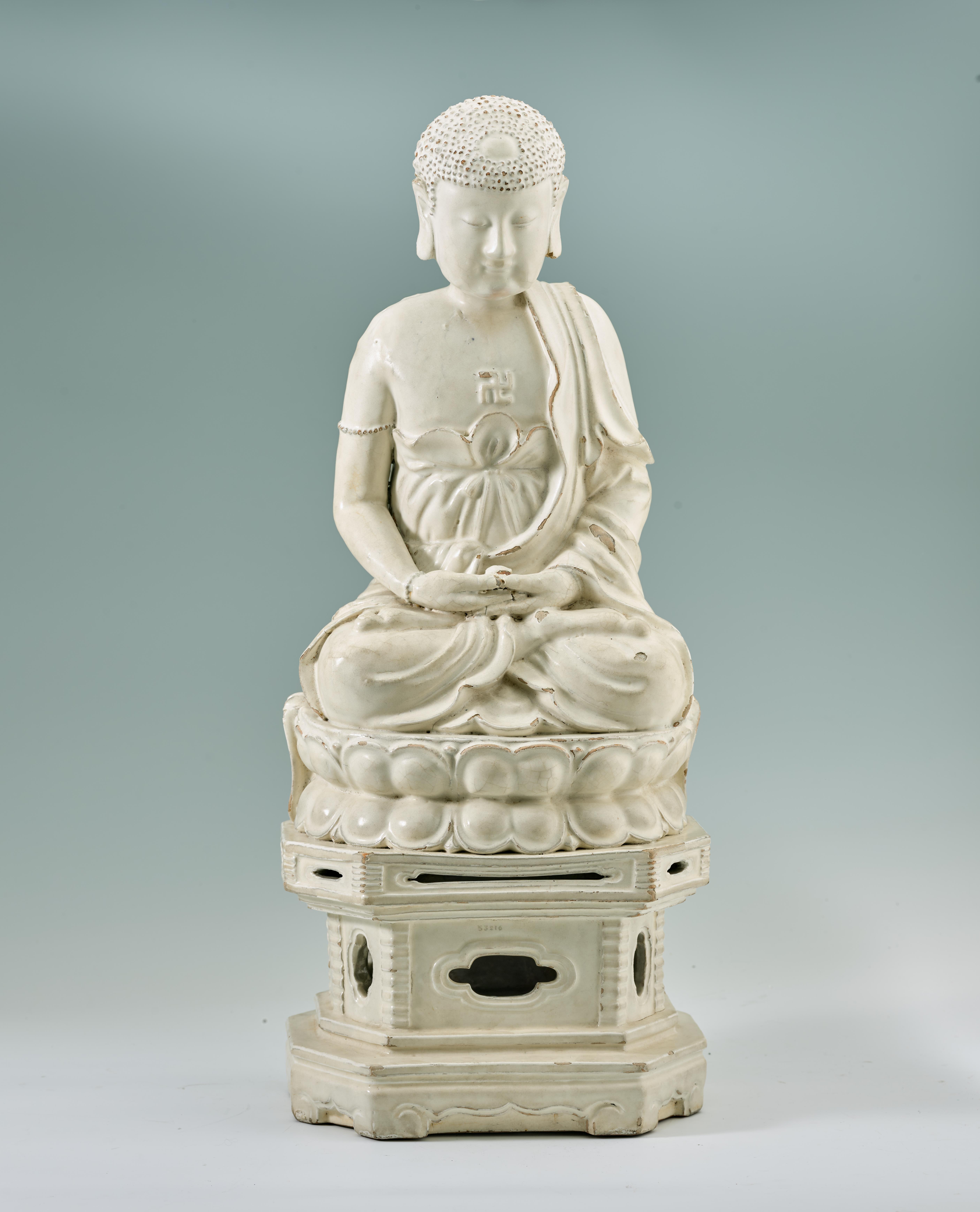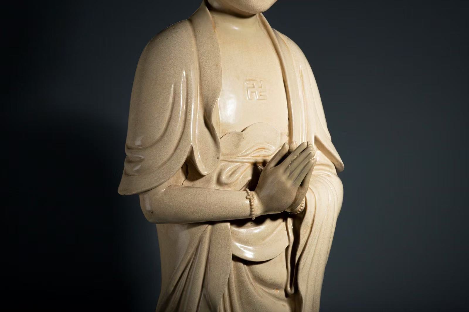 上海博物館有一尊漳州窯白釉佛像明代,高 63.5 cm。白釉略帶米色,光澤柔和;雲紋台座;底部同樣見麻布紋與通氣孔。