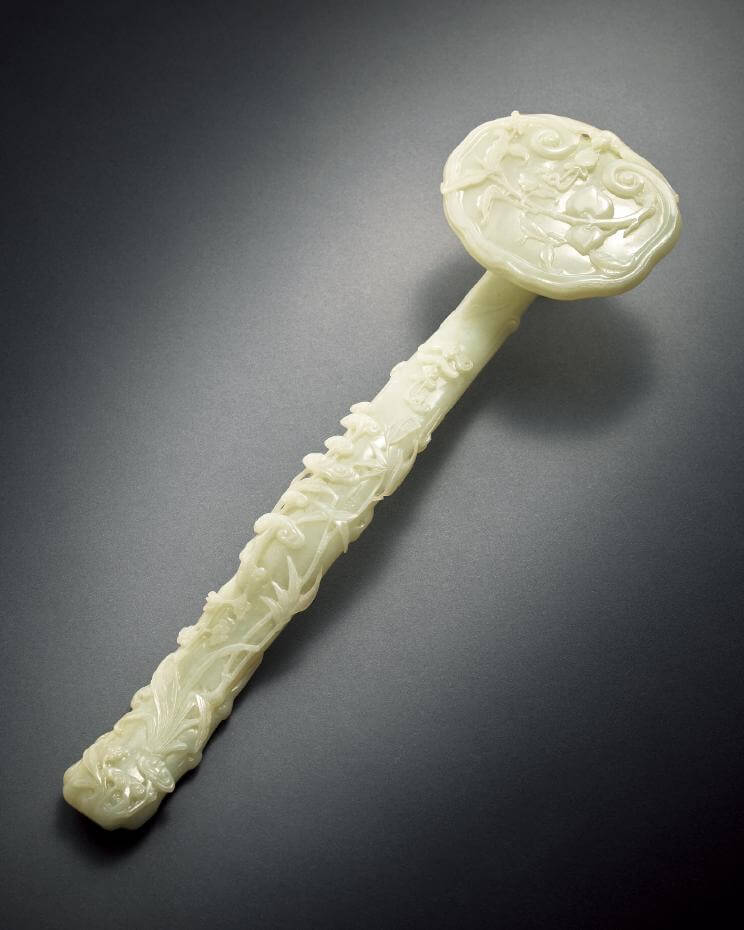 尤為矚目者,通器施以圓凸透雕技法,紋飾層層起伏,虛實有度,刀法圓熟,工藝精緻,且整器玉質通體一致,瑩潔無瑕。此等手法於傳世玉器中殊為罕見,兩岸故宮與拍場紀錄亦難覓先例。僅北京故宮所藏一件青玉圓雕如意構造略近,然就玉種之潔潤、形制之嚴整、工藝之成熟而言,仍難與本器相較,堪稱孤例。如意全長高達四十八公分,規模宏闊,遠超清代同類宮廷器物之常例,於全球博物館與拍賣市場中皆屬鳳毛麟角。結合其玉質之上乘、雕法之罕見、形制之端凝,此器實集乾隆盛世玉作之大成。沉潛十餘載,今再現拍場,誠為專注收藏宮廷御用珍品者不可多得之良機,亦為行家所宜珍視之傳世佳構。綜觀此件白玉如意,玉質溫潤凝潔,色相純白澄明,且以整料雕成,體量宏碩,尤為罕見。構形端凝穩健,紋飾繁縝而井然,主題統一而寓意深遠。自柄端至器首,靈芝盤曲,貫通全器,氣脈綿延;青竹與水仙並生相映,寓四時常青、清芬長在;祥蝠、壽桃與綬帶交輝照映,使「萬壽長春」之旨臻於完備。其雕工之精微、設計之嚴整、語彙之純粹,無不體現乾隆盛世宮廷玉作的成熟格制與至高美學。