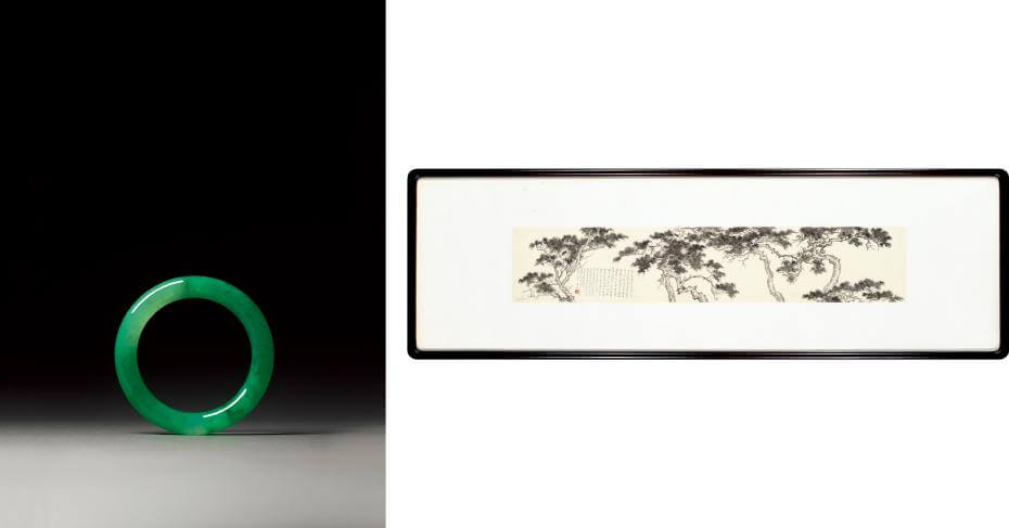 ▲LOT 3079 清 翡翠滿綠冰種手鐲,手圍:18.5,預估價新台幣60萬至120萬(左);LOT 3080 溥心畬《懷戒臺寺古松》,1956年,鏡框 水墨 紙本,16×84公分,預估價新台幣200萬至300萬(右)。