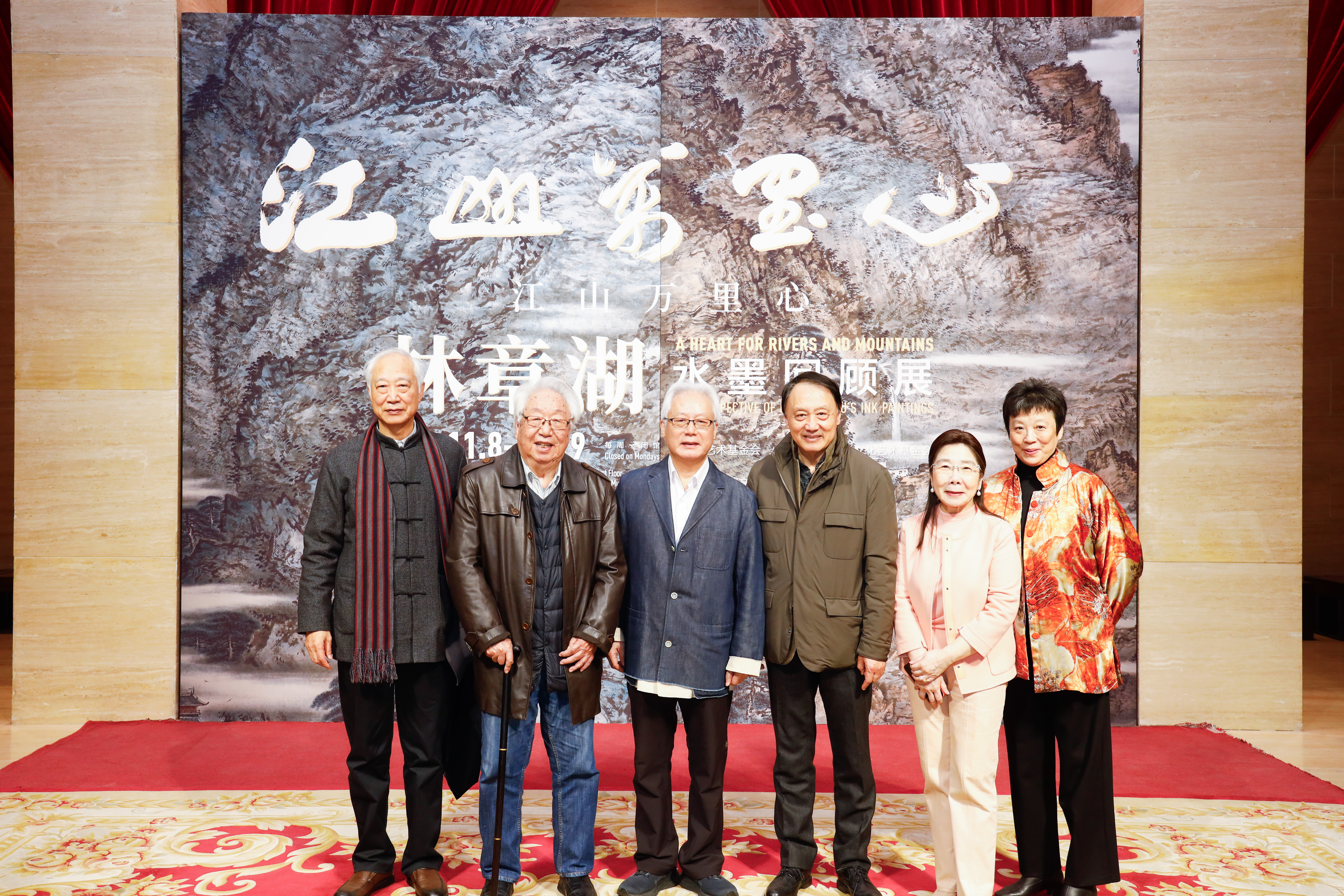 林章湖在北京中國美術館展覽開幕式留影,左起依序為:中央美術美院教授 羅世平、中國美術家協會中國畫藝委會前秘書長 孫克 、藝術家 林章湖 、北京畫院前院長 王明明、策展人 陳筱君、 李可染藝術基金會理事長 劉瑩