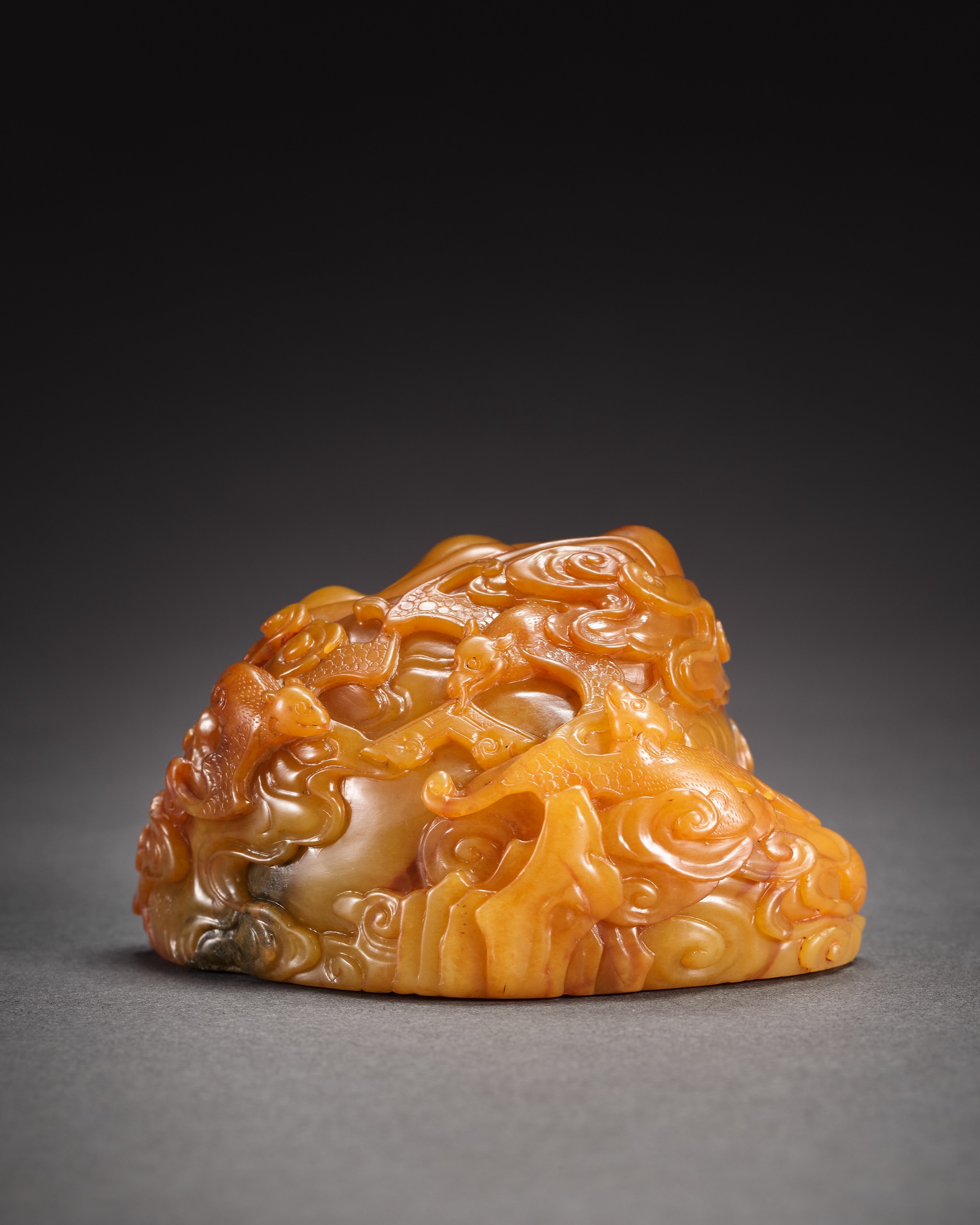 ▲LOT 1104 靜公七秩壽禮 尚均款 田黃浮雕洪福紋「天保九如」隨形章,L17.9cm;W220g,預估價新台幣800萬至1,200萬。
