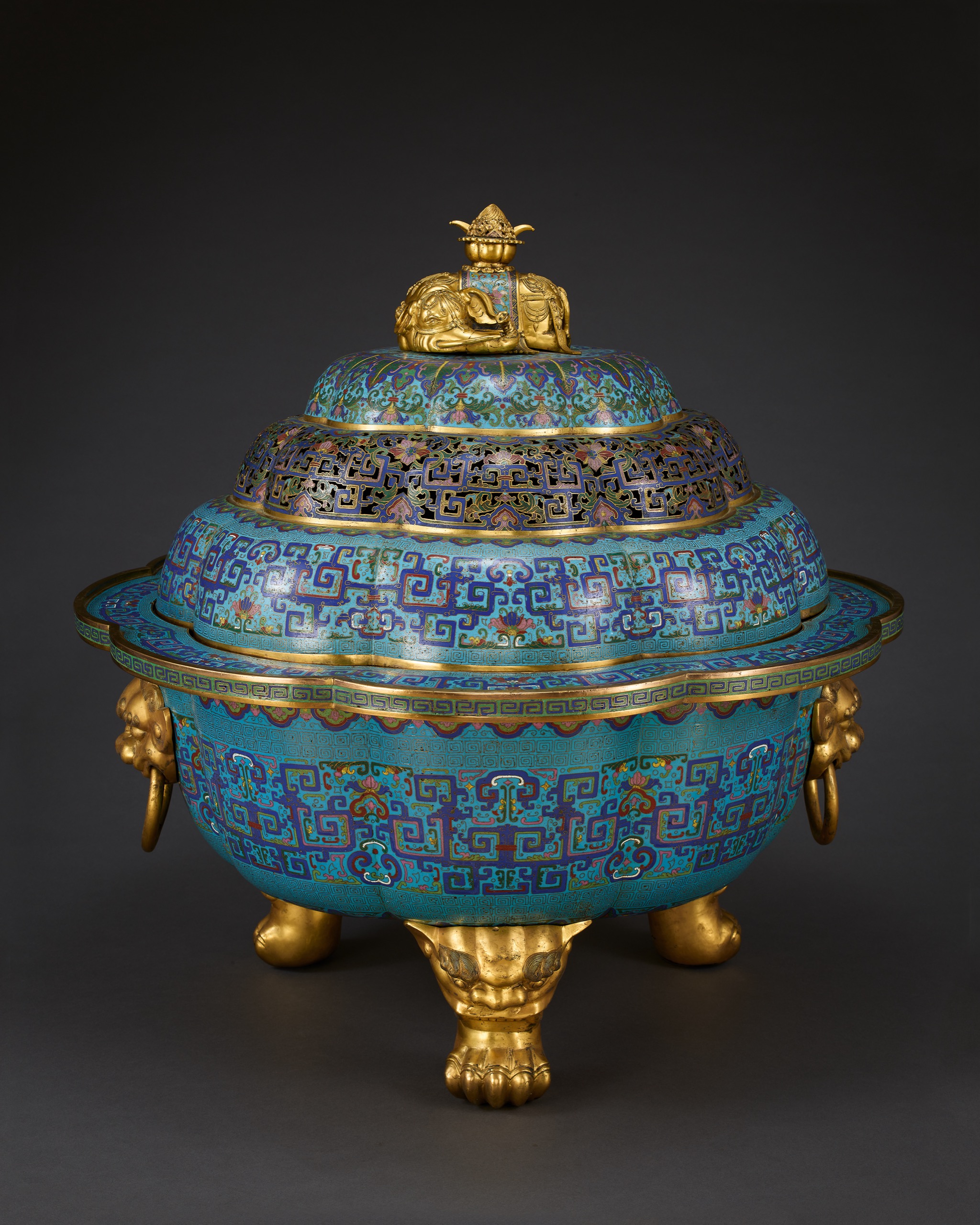 ▲LOT 1110 清乾隆 御製銅胎掐絲琺瑯鏤空象鈕葵形大薰爐,H75×D75cm,預估價新台幣500萬至800萬。來源:1. 法國坎城地區重要家族, 得自於19 世紀中期, 北京