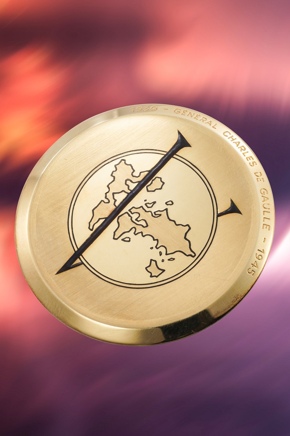 琺瑯工藝由 Stern 錶盤工坊(Maison Stern)的米歇爾·德維爾(Michel Deville)操刀,相關設計過程完整記錄於 Stern 檔案之中。所有四枚懷錶的錶背採用相同的設計,由雕刻大師艾德加·梅爾基(Edgar Maerky)親手雕刻:一個象徵勝利的巨大字母「V」覆蓋於世界地圖之上,下方則鐫刻專屬題字。本枚懷錶刻有「1939 – General Charles De Gaulle – 1945」。