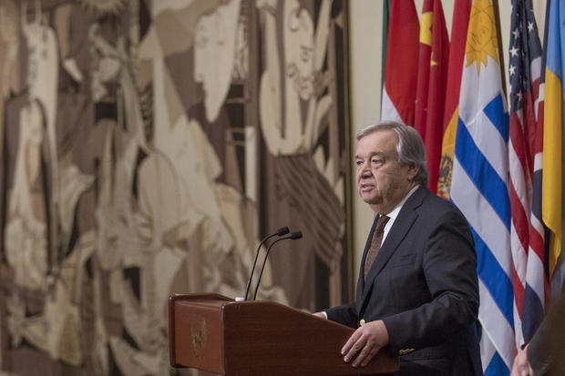 聯合國秘書長安東尼奧·古特雷斯站在掛毯前致詞的歷史鏡頭