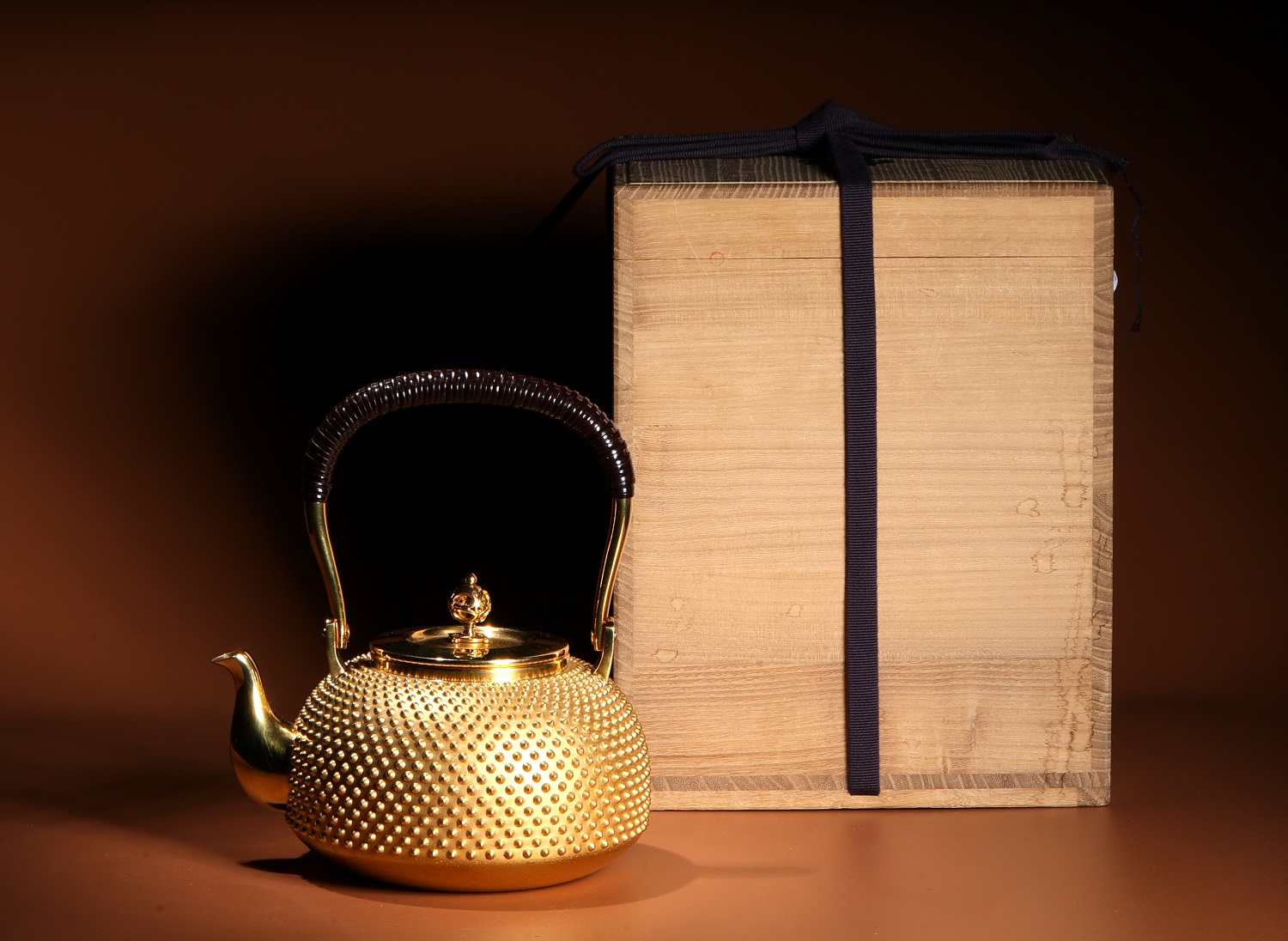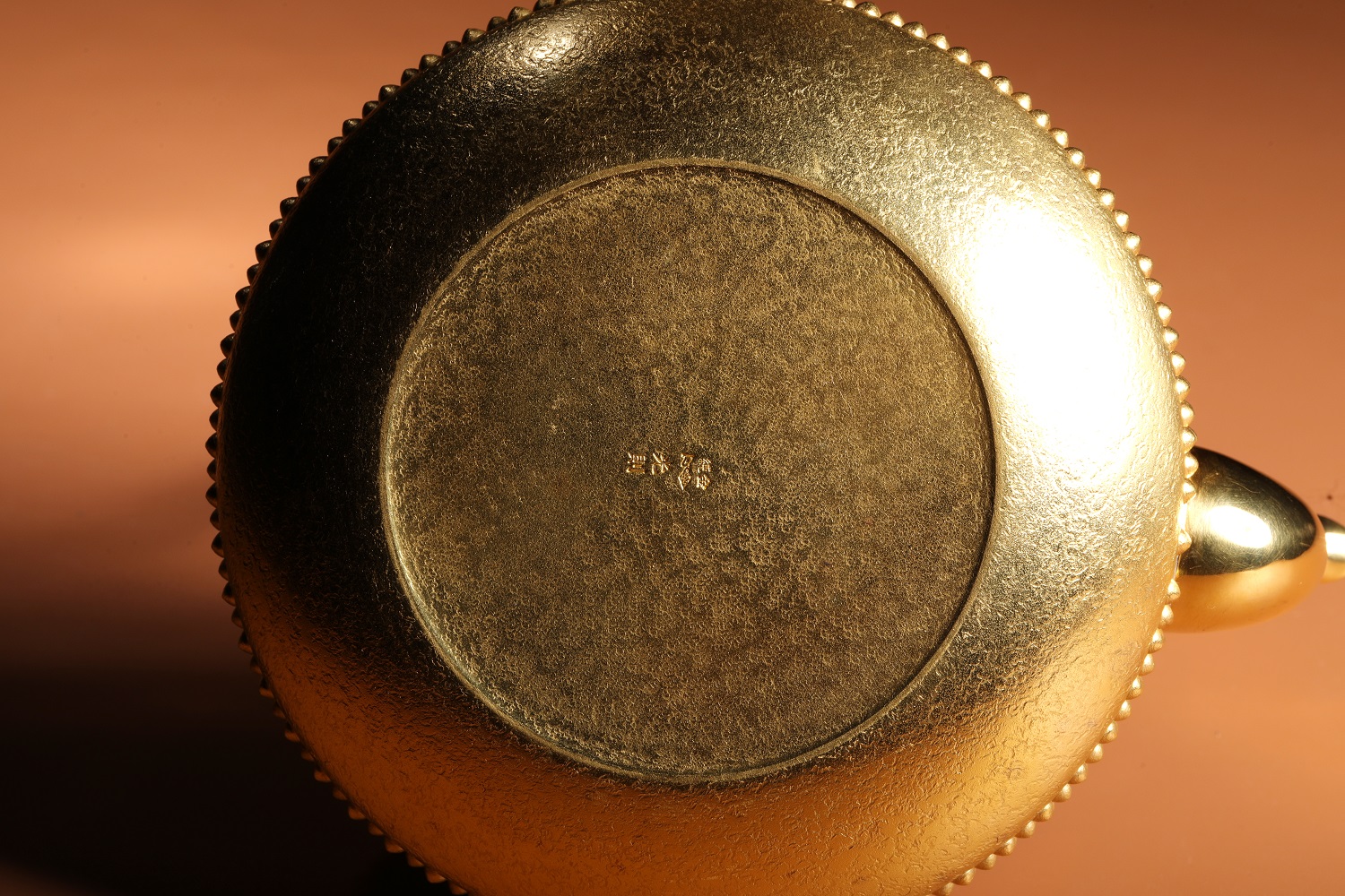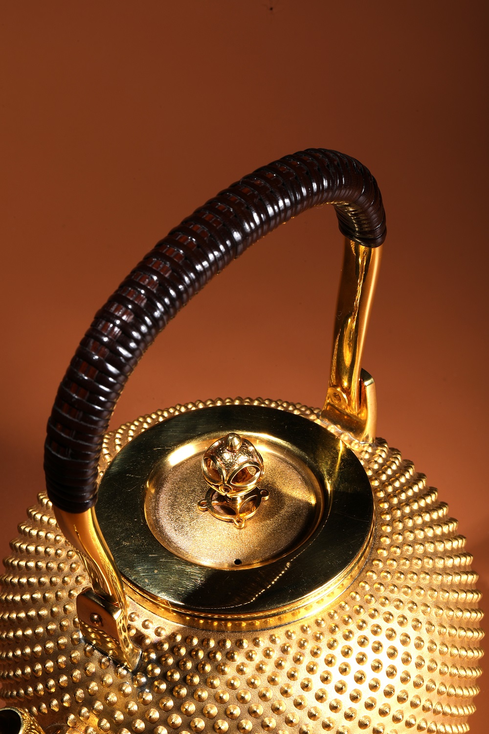 此金壺整器純金打造,使用純度99.9%以上的24K黃金製作。以手工逐一槌出霰紋, 繁工精湛。純金質感華美尊貴,提樑以編藤覆蓋,整器在質感與色澤上比對強烈,予人無上的視覺享受。底款有純金、光則及日本造幣局999純金符號, 堪稱日本最高檔的純金壺。