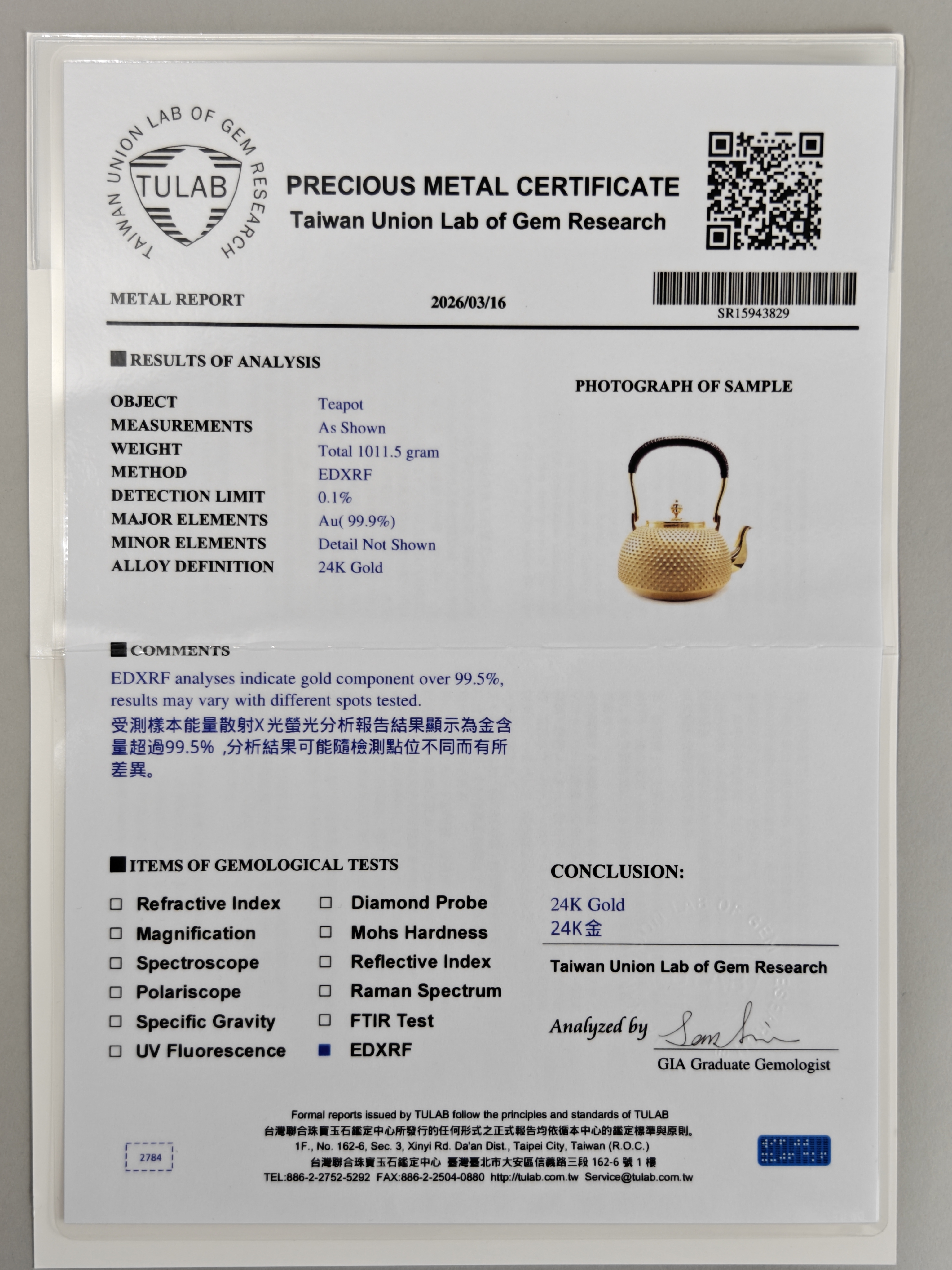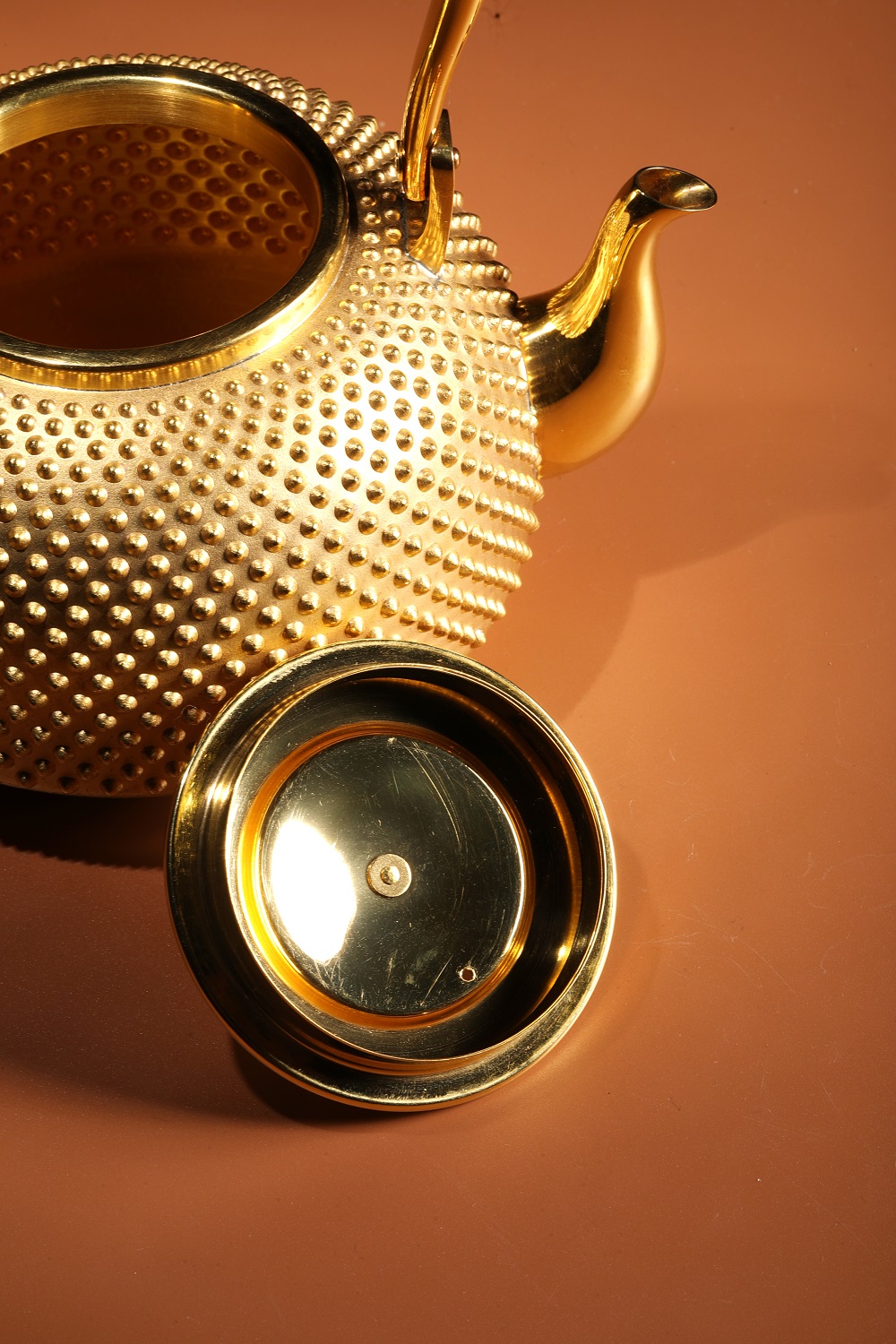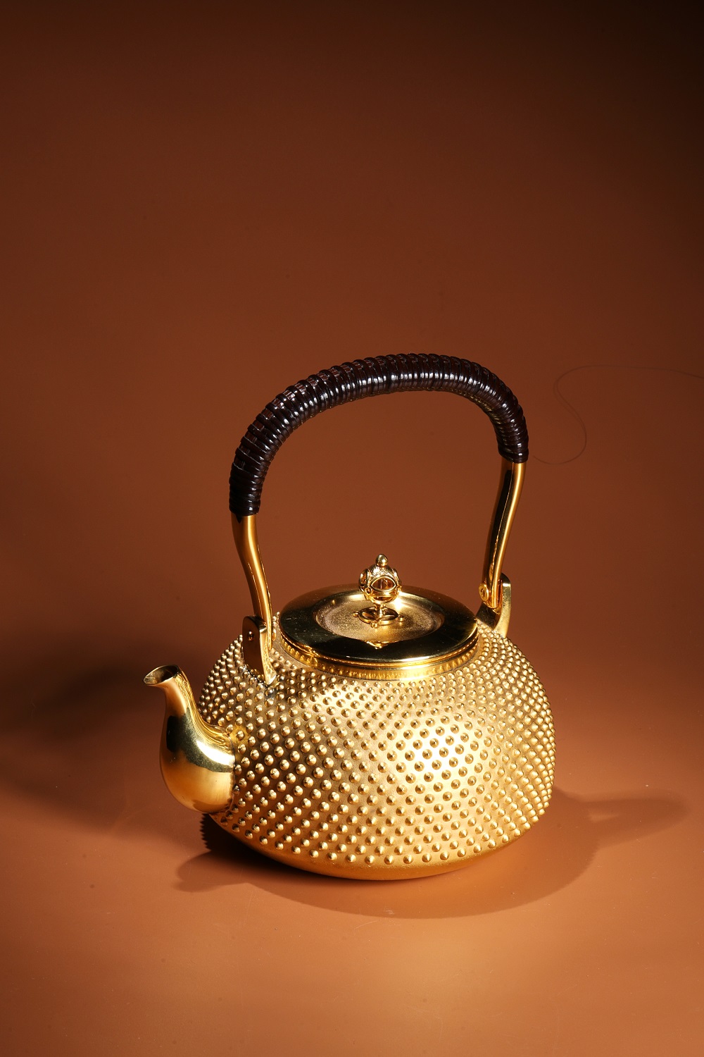 此金壺整器純金打造,使用純度99.9%以上的24K黃金製作。以手工逐一槌出霰紋, 繁工精湛。純金質感華美尊貴,提樑以編藤覆蓋,整器在質感與色澤上比對強烈,予人無上的視覺享受。底款有純金、光則及日本造幣局999純金符號, 堪稱日本最高檔的純金壺。