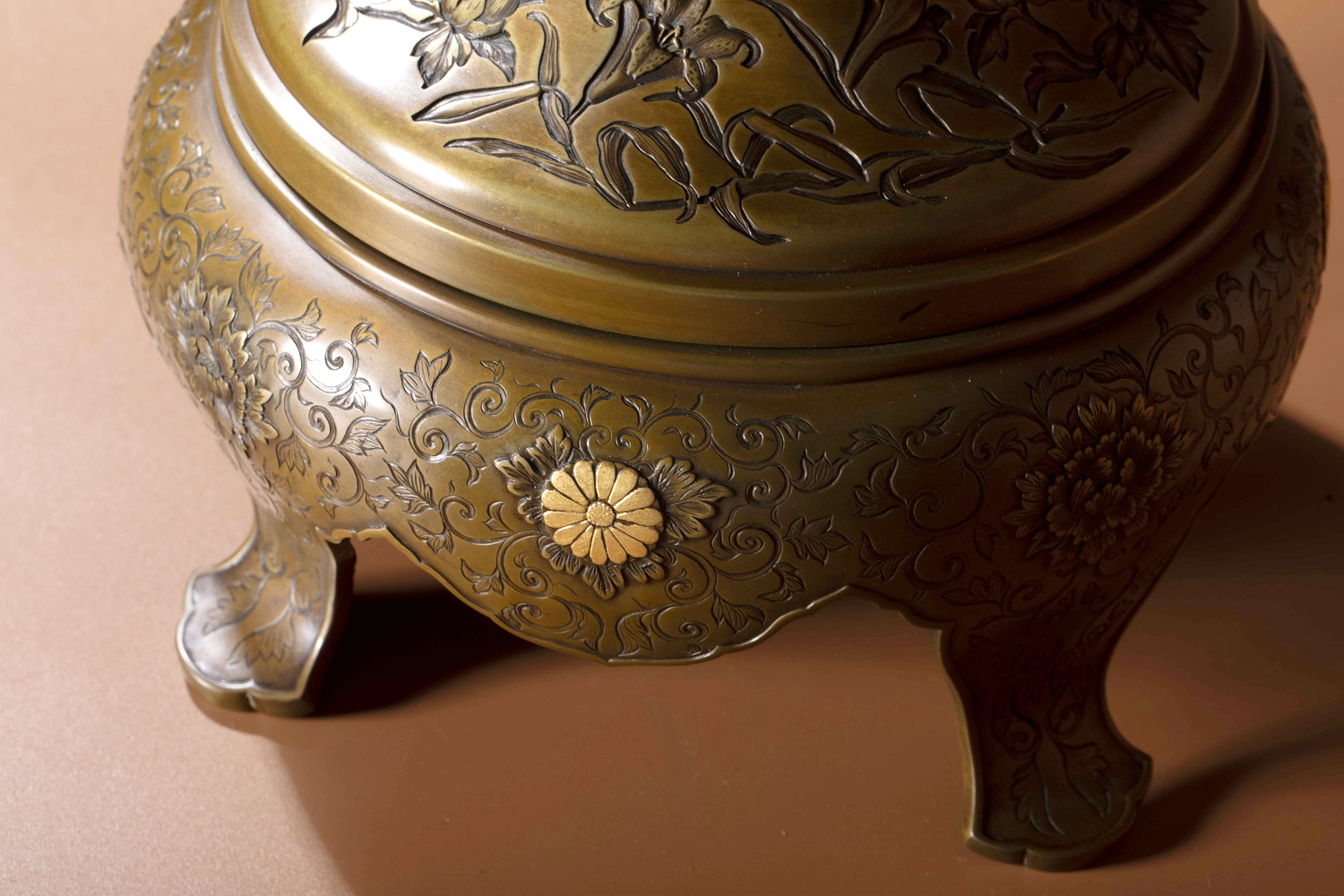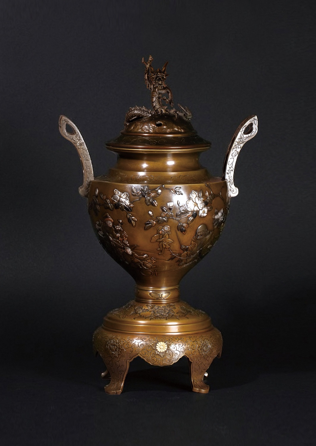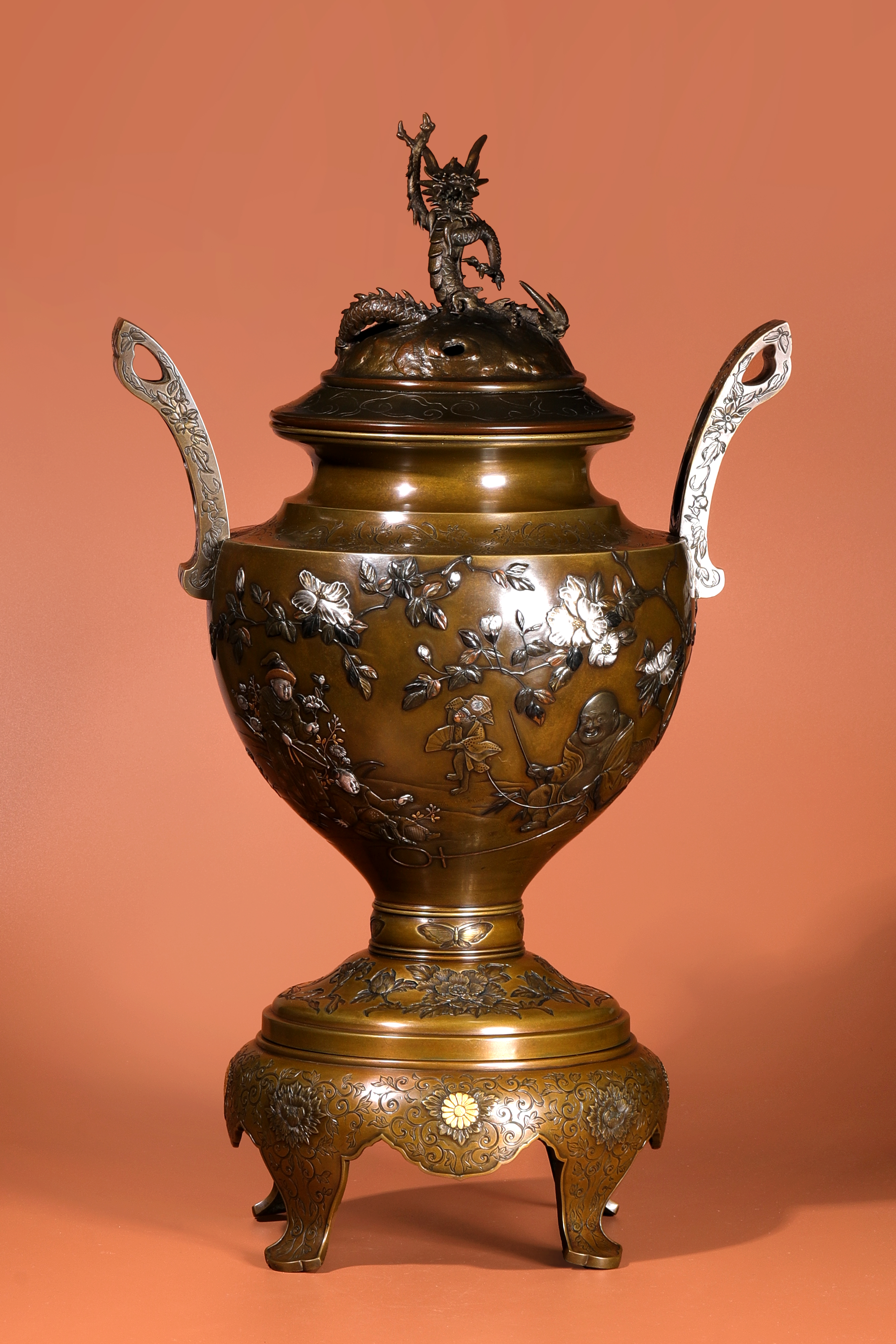 Lot. 6131 明治 中杉與三七造 龍鈕金銀象嵌菊紋鑄銅香爐