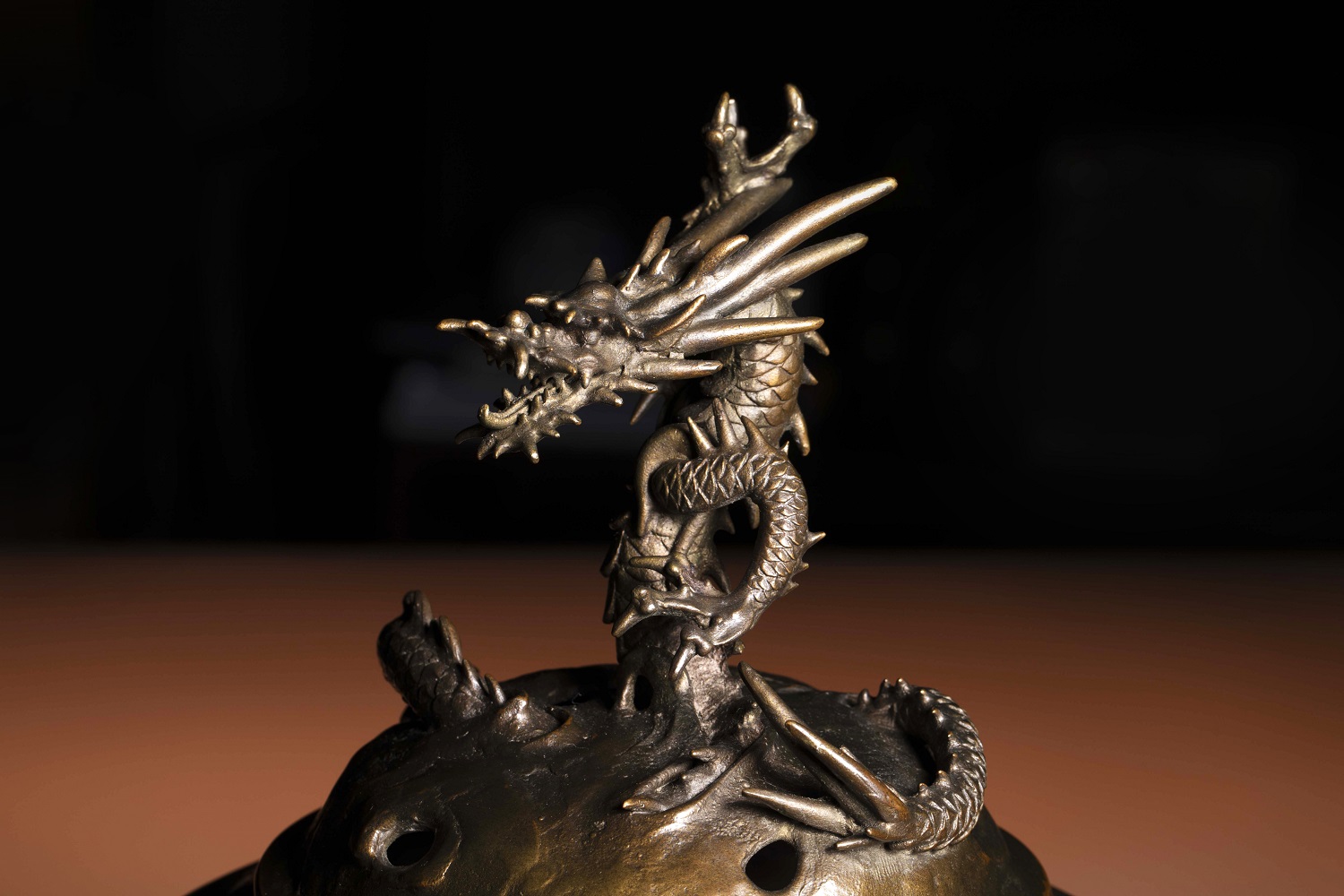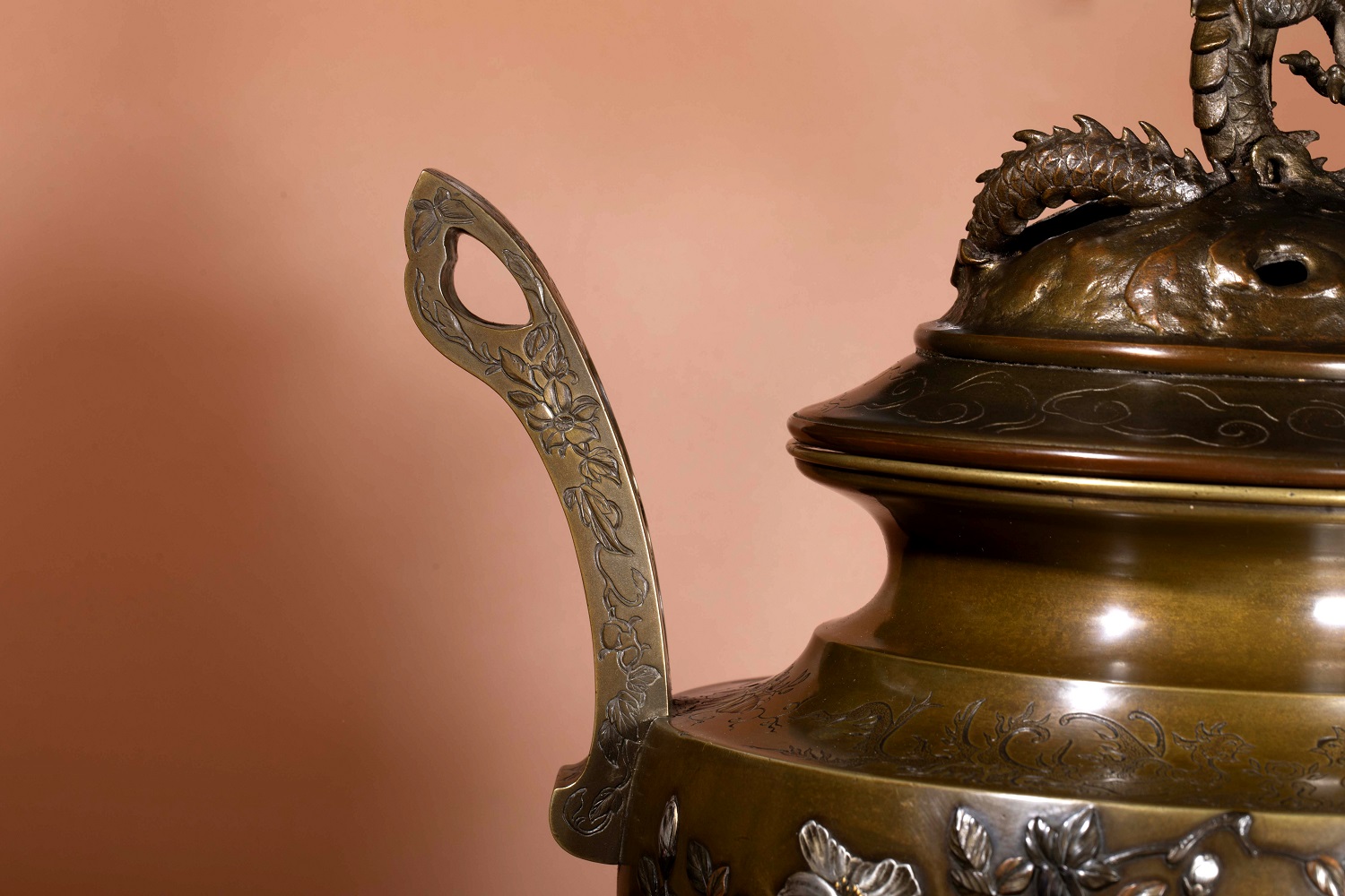 蓋頂龍鈕塑造尤為生動,龍身盤旋,氣勢昂揚。與清代中國宮廷器物中較為威儀化的龍形不同,本件之龍更強調動態與裝飾性,呈現出日本藝術中常見的「活態」表現。