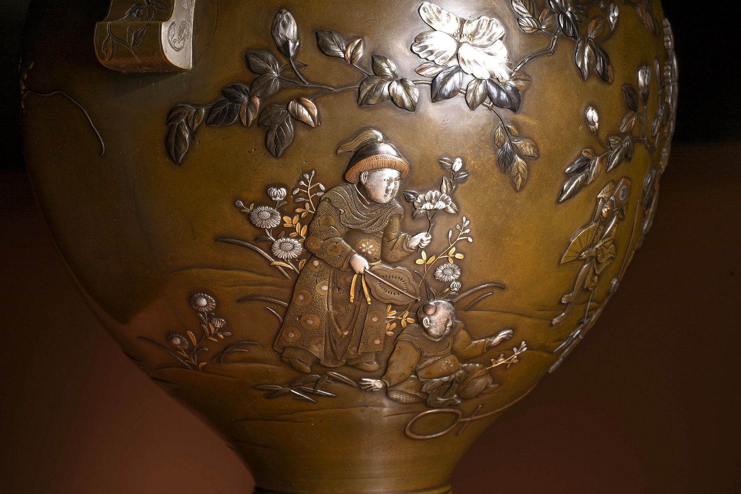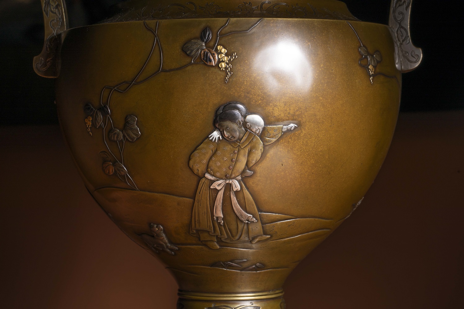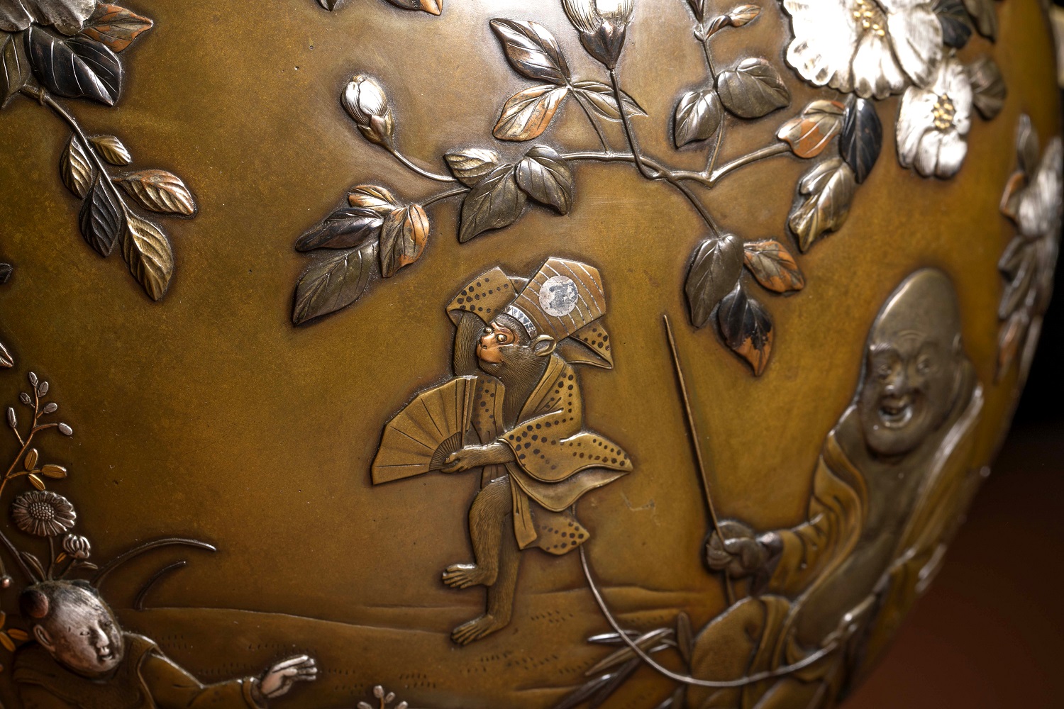 金、銀與赤銅(或四分一)之色澤交錯,在深沉銅地上形成層次分明而不流於浮華的視覺效果,呈現出一種近似繪畫的敘事性表面。