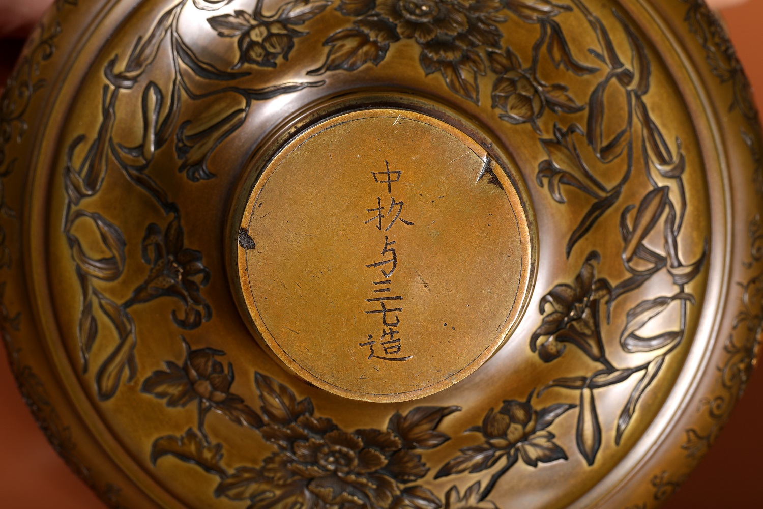 底部署款「中杉與三七造」,其中「造」字表明為製作標記。此類款識多見於明治時期之工房或合作體系,反映當時金工製作已發展為高度分工的工藝生產模式。